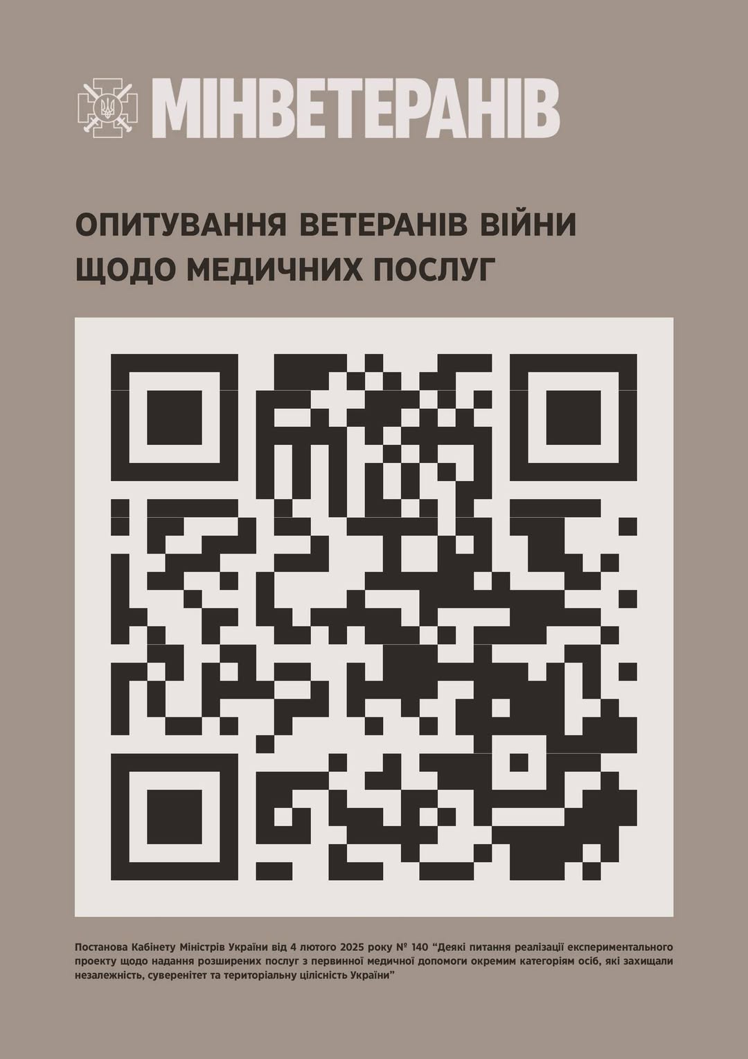 Ми розуміємо, наскільки цінним є ваш час, тому просимо приділити кілька хвилин для заповнення анкети. Ваша участь є надзвичайно важливою для формування ефективної політики у сфері охорони здоров’я ветеранів. Це унікальна можливість вплинути на майбутнє медичного забезпечення, зробити його більш доступним, якісним та відповідати вашим реальним потребам. Опитування є конфіденційним, а зібрані дані будуть використані виключно для аналізу та покращення послуг. Просимо вас перейти за посиланням для заповнення анкети: