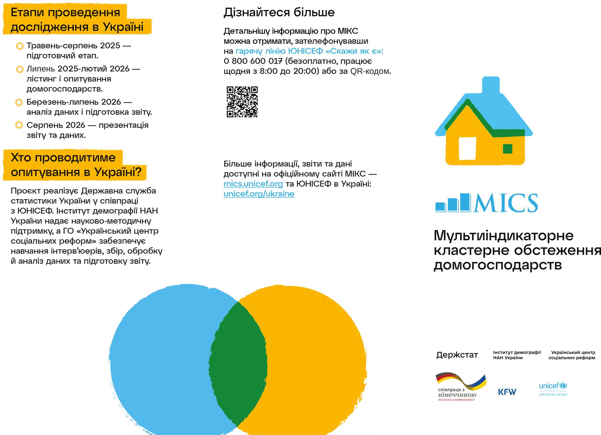 Державна служба статистики України спільно з Інститутом демографії ім. М. В. Птухи, ГО “Український центр соціальних реформ” та за підтримки ЮНІСЕФ запускає масштабне Мультиіндикаторне кластерне обстеження домогосподарств (МІКС).