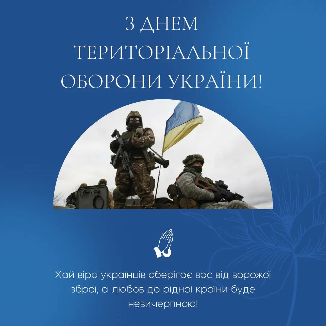 Сьогодні Україна відзначає особливе свято – День Сил територіальної оборони. Це день вшанування мужніх захисників, які стали невід’ємним щитом нашої суверенної держави. Їхня непохитна відвага та готовність стати на захист Батьківщини є запорукою нашої безпеки та спокою. Сили територіальної оборони – це справжні герої сучасності, які своєю самовідданістю демонструють найвищий рівень патріотизму та громадянської відповідальності. Вони є втіленням незламного духу українського народу, його здатності об’єднуватися перед обличчям будь-яких викликів. Вміння долати найскладніші обставини, знаходити надію там, де здається, що її вже немає, – це та іскра, яка надихає інших не втрачати віри. Кожен боєць Сил ТрО – це приклад стійкості, сили волі та глибокої любові до своєї країни. Їхня готовність захищати кожного з нас, нашу землю, нашу незалежність, заслуговує на найглибшу шану та вдячність. Ми схиляємо голови перед їхньою мужністю, адже саме завдяки їм ми маємо можливість жити, працювати та будувати майбутнє України. Нехай це свято стане нагадуванням про неоціненний внесок кожного захисника в нашу спільну перемогу та збереження миру.