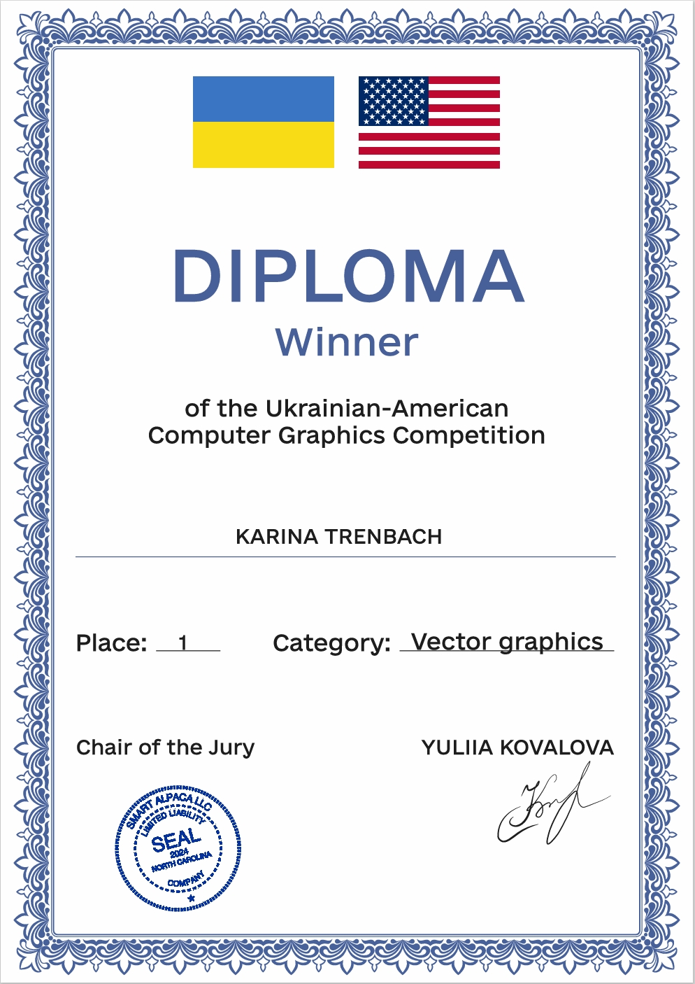 Міжнародне журі, оцінюючи роботи конкурсантів, відзначило високий рівень представлених проєктів. Серед 12 учасників зі Сполучених Штатів, 15 з України та 2 з Казахстану, переможцем у номінації «Векторна графіка» стала Каріна Тренбач, керівниця гуртків Гадяцького будинку дитячої та юнацької творчості. Її робота вразила журі своєю глибиною та емоційністю.