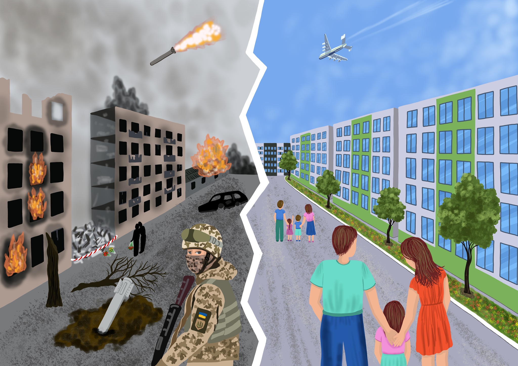 «Якщо запитати в українців про їхні мрії про майбутнє, я впевнена, що кожен скаже про мир, повернення військовослужбовців до своїх сімей та відбудову нашої країни. Саме це зображено праворуч в роботі, а ліворуч – наше сьогодення, яке навіть після завершення війни залишиться в пам’яті кожного українця», – розповіла Каріна про свою роботу, яка символічно поєднує минуле, сьогодення та майбутнє України.