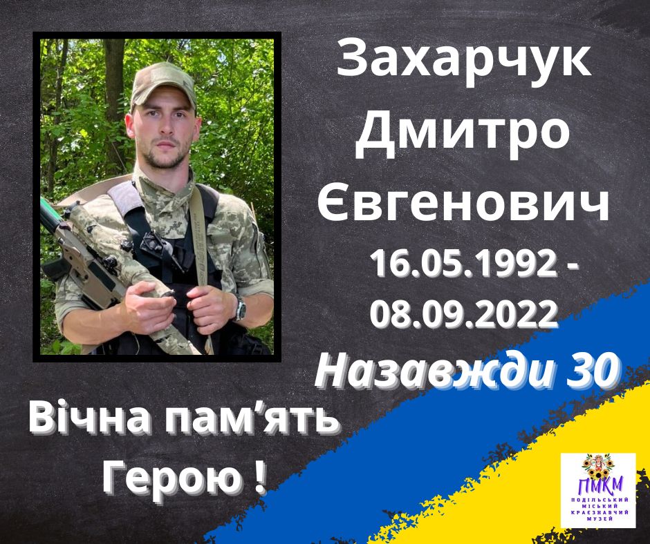 Сьогодні вся Україна вшановує пам’ять нашого земляка, Героя, який віддав своє життя за свободу та незалежність Батьківщини – ЗАХАРЧУКА ДМИТРА ЄВГЕНОВИЧА. 8 вересня 2022 року, під час виконання надзвичайно важливого бойового завдання, Дмитро героїчно загинув у запеклих боях з російськими окупантами. Трагічна подія сталася поблизу села Костромка, що на Херсонщині. Його подвиг навічно вписаний в історію боротьби за нашу землю.