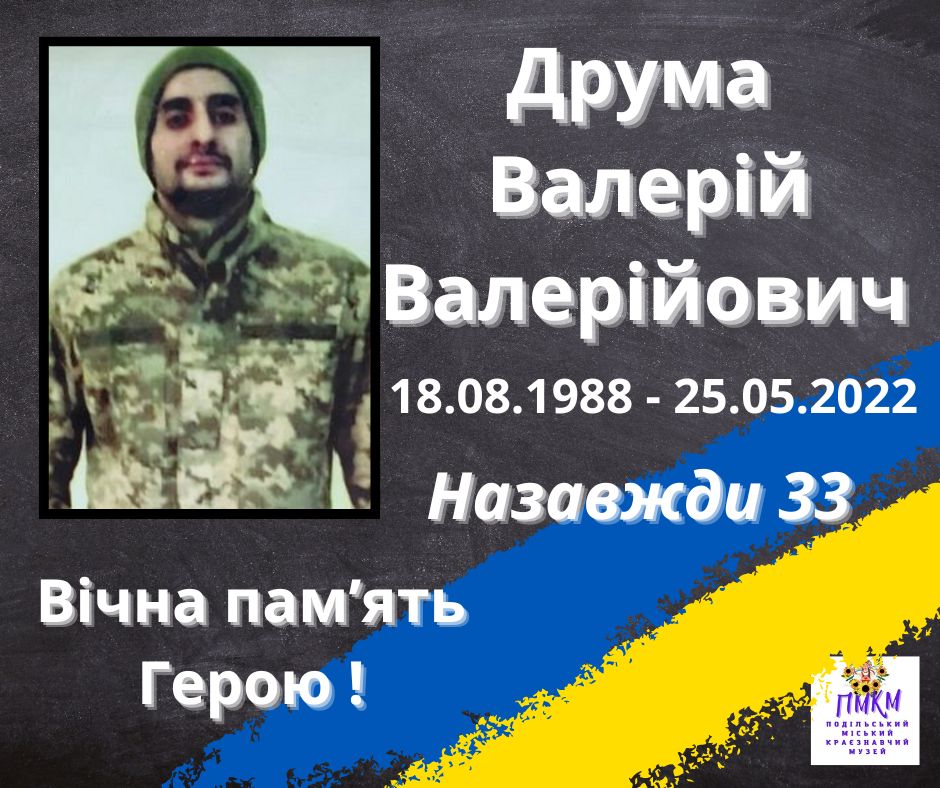 25 травня 2022 року Україна втратила ще одного Героя – Друму Валерія Валерійовича, який загинув у бою за Сєвєродонецьк, Луганської області, захищаючи рідну землю від російських окупантів. Його подвиг назавжди залишиться в нашій пам’яті.
