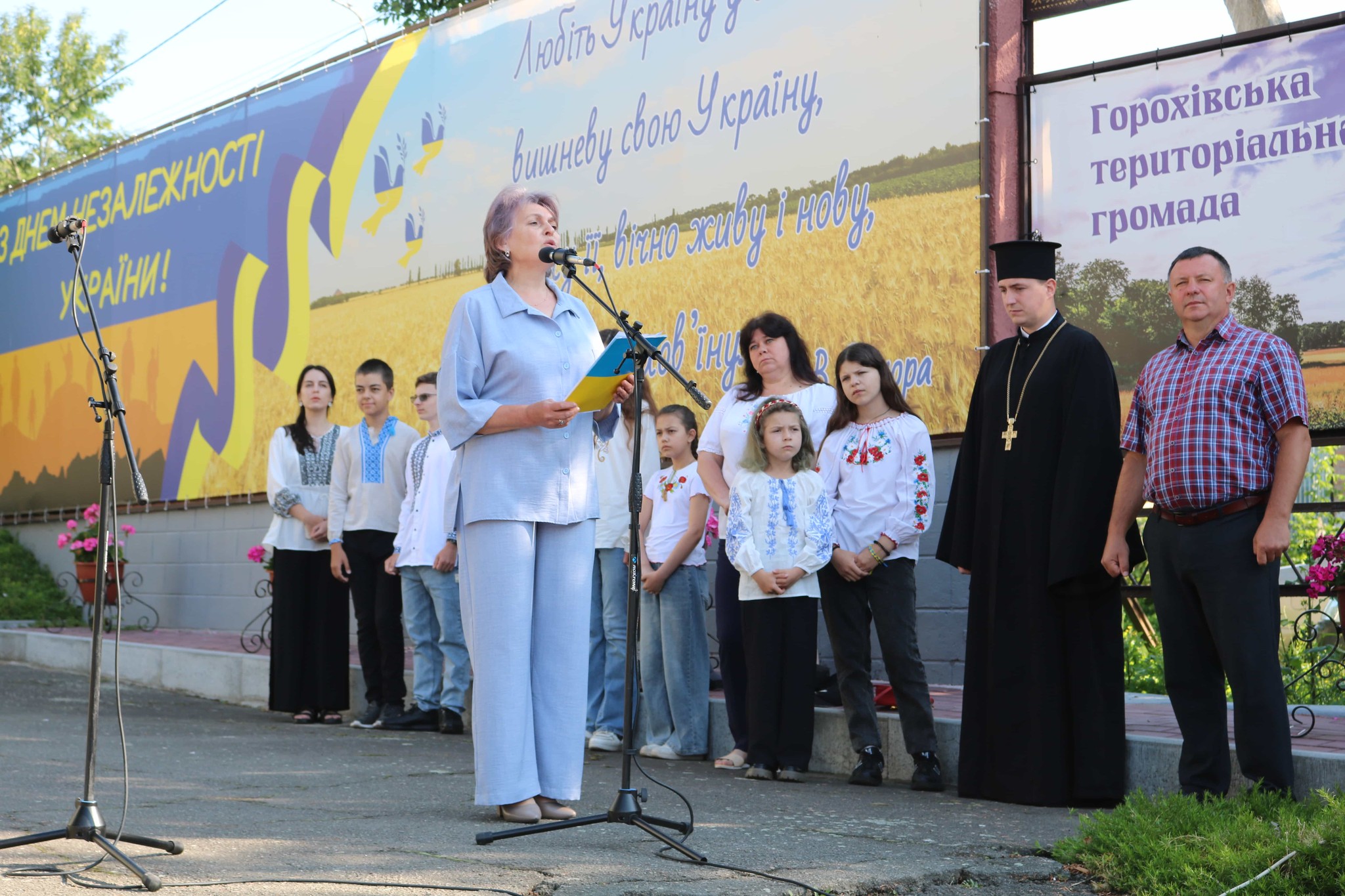 — В нашій країні триває війна… Українські захисники нині гинуть від ворожого вогню. Вони захищають нашу землю, кожен її клаптик, і кожен сантиметр історії. Найбільше болю завдають звістки про втрату наших земляків — героїв, які віддали своє життя за свободу України, за її незалежність і цілісність. Сьогодні — День Української Державності. У всіх православних церквах країни вшанували пам’ять Київського князя Володимира Великого та відзначили День Хрещення Русі-України. Це державне свято підкреслює нерозривний зв’язок між нашим минулим і сучасністю. Ми — нащадки великої історії, яку творили від княжих часів і до сьогодення, — наголосила ведуча Любов Погудіна.