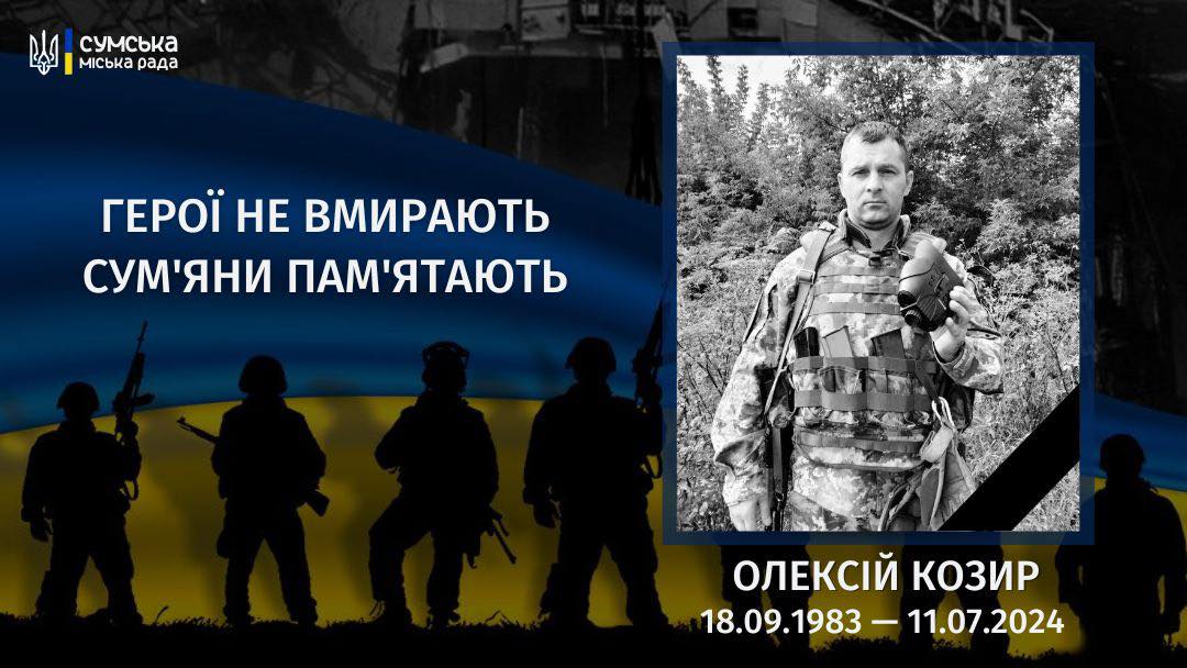 Герої не вмирають! Сумʼяни пам’ятають! Минув рік з дня трагічної загибелі Олексія Козира, справжнього Захисника України, чия пам’ять назавжди закарбована в історії Сумщини. 11 липня минулого року Україна втратила одного зі своїх синів, який віддав найцінніше – своє життя – за свободу та незалежність Батьківщини. Вшановуючи вічну пам’ять Олексія Козира, ми згадуємо його життєвий шлях, сповнений відданості та любові до рідної землі. Цей день є нагадуванням про подвиги всіх воїнів, що захищають нашу країну.Олексій народився 18 серпня 1983 року у мальовничому селі Стецьківка Сумської області. З дитинства він виявляв старанність та цілеспрямованість, навчаючись у місцевій школі. Його прагнення до знань привело його до Сумської філії Харківського національного університету внутрішніх справ, де Олексій здобув вищу освіту. Доленосна зустріч з повномасштабним вторгненням Росії застала його за кордоном, де він працював водієм. Проте, почуття обов’язку та патріотизму не дозволили йому залишитися осторонь, коли рідній державі загрожувала небезпека.Не вагаючись, Олексій добровільно повернувся в Україну та став до лав Збройних Сил України, щоб захищати рідну землю від ворога. Його військова служба була прикладом мужності та самовідданості. Він не шукав легких шляхів, завжди був там, де його допомога була найпотрібнішою. Завдяки своїй відданості та професіоналізму, Олексій Козир був відзначений високими державними нагородами – медалями «За службу Україні» та «За оборону рідної держави». Ці відзнаки є свідченням його значного внеску у захист суверенітету та територіальної цілісності України, підкреслюючи його незламний дух.Трагічна новина про загибель Олексія сколихнула всю Сумщину. Він помер 11 липня 2024 року в одній з лікарень, отримавши важкі поранення під час запеклих бойових дій на Донеччині. Його смерть стала величезною втратою для родини, друзів та всієї України, але його жертовність ніколи не буде забута. Поховали Захисника з усіма військовими почестями на Алеї Слави Центрального кладовища міста Суми, де спочивають ті, хто віддав своє життя за наше майбутнє, за мирне небо над Україною.Щоб увічнити пам’ять Олексія Козира та визнати його неоціненний внесок у захист країни, рішенням Сумської міської ради йому було посмертно присвоєно почесне звання «Почесний громадянин міста Суми». Це звання є символом глибокої поваги та вдячності громади Сум до свого Героя, який навічно залишиться в серцях.Ми, жителі Сумщини, завжди пам’ятатимемо подвиг Олексія Козира та інших Захисників, які стоять на варті нашої свободи. Їхня самопожертва є нагадуванням про високу ціну миру та незалежності. Пам’ять про цього мужнього воїна буде жити в наших серцях, надихаючи нові покоління на відстоювання справедливості та правди. Нехай його приклад надихає нас усіх на щоденну працю заради перемоги. Вічна пам‘ять Героєві! Слава Захисникам і Захисницям України!
