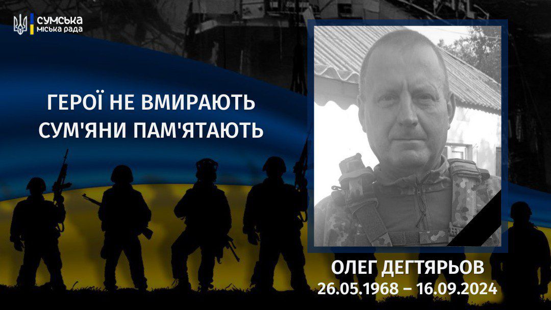 Рік тому, 16 вересня 2024 року, в нелегких боях на Донеччині, захищаючи нашу землю, загинув Герой України Олег Дегтярьов, позивний “Гудя”. Сумщина пам’ятає свого сина. Ця дата назавжди залишиться в серцях тих, хто знав Олега, хто цінує його подвиг заради свободи України.