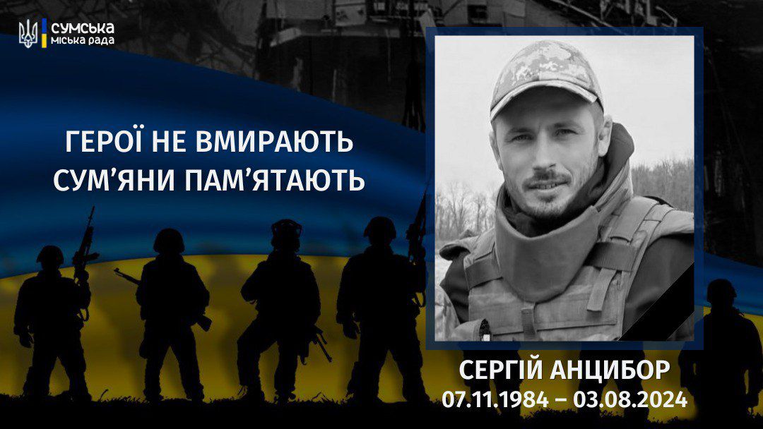 Рік тому, 3 серпня 2024 року, Суми втратили одного зі своїх героїв — Сергія Анцибора (позивний «Анцик»). Ця дата стала трагічною для міста, адже минув рік від дня загибелі Сергія під час виконання бойового завдання на Донецькій області. Його пам’ять вшановують з глибокою повагою та скорботою.