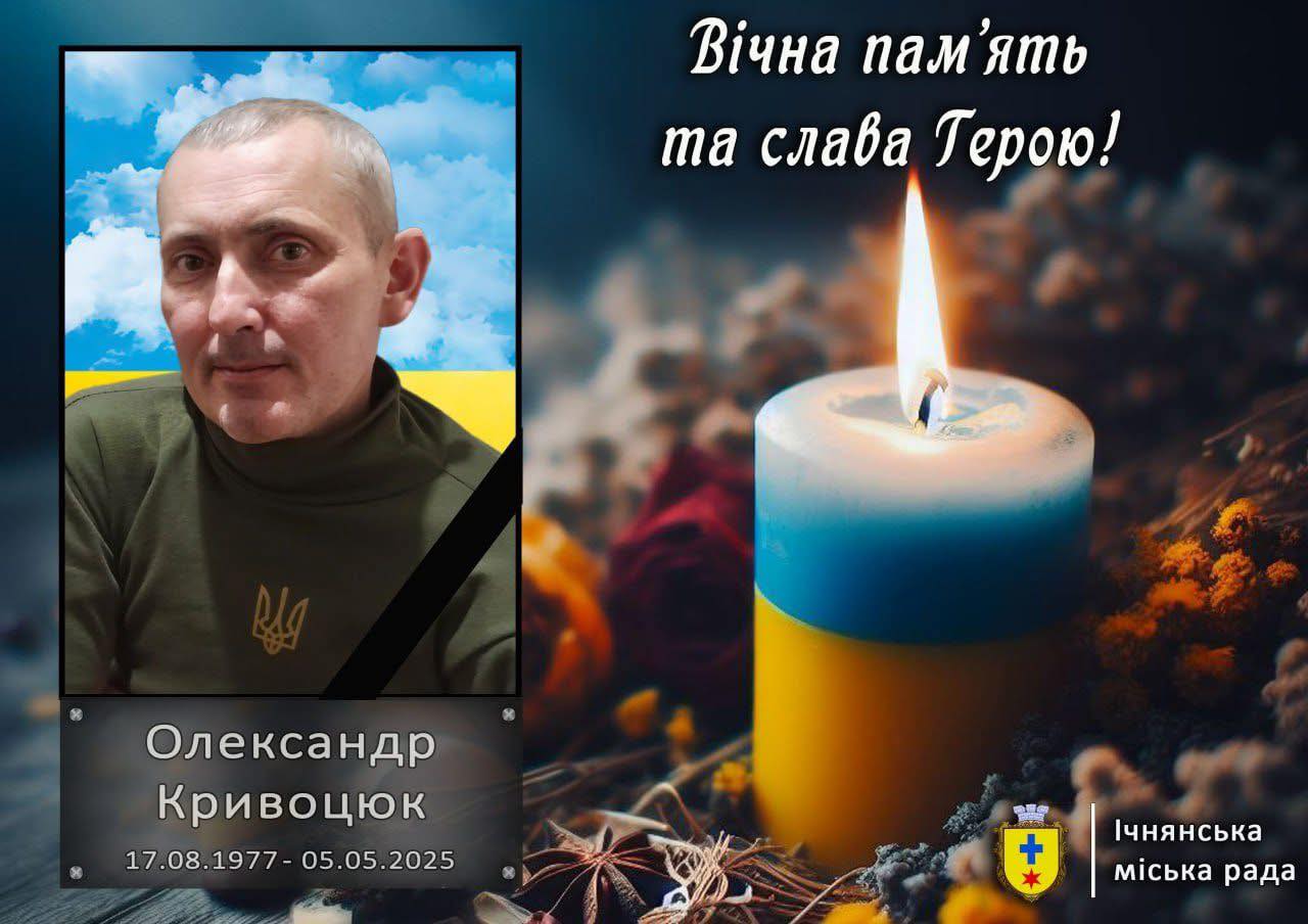 Шановна громадо! Сьогодні, 12 травня, Ічнянщина зустрічає Героя, старшого солдата ЗСУ Олександра Кривоцюка, який повертається додому «на щиті». Просимо долучитися до вшанування пам’яті захисника та створити живий коридор.