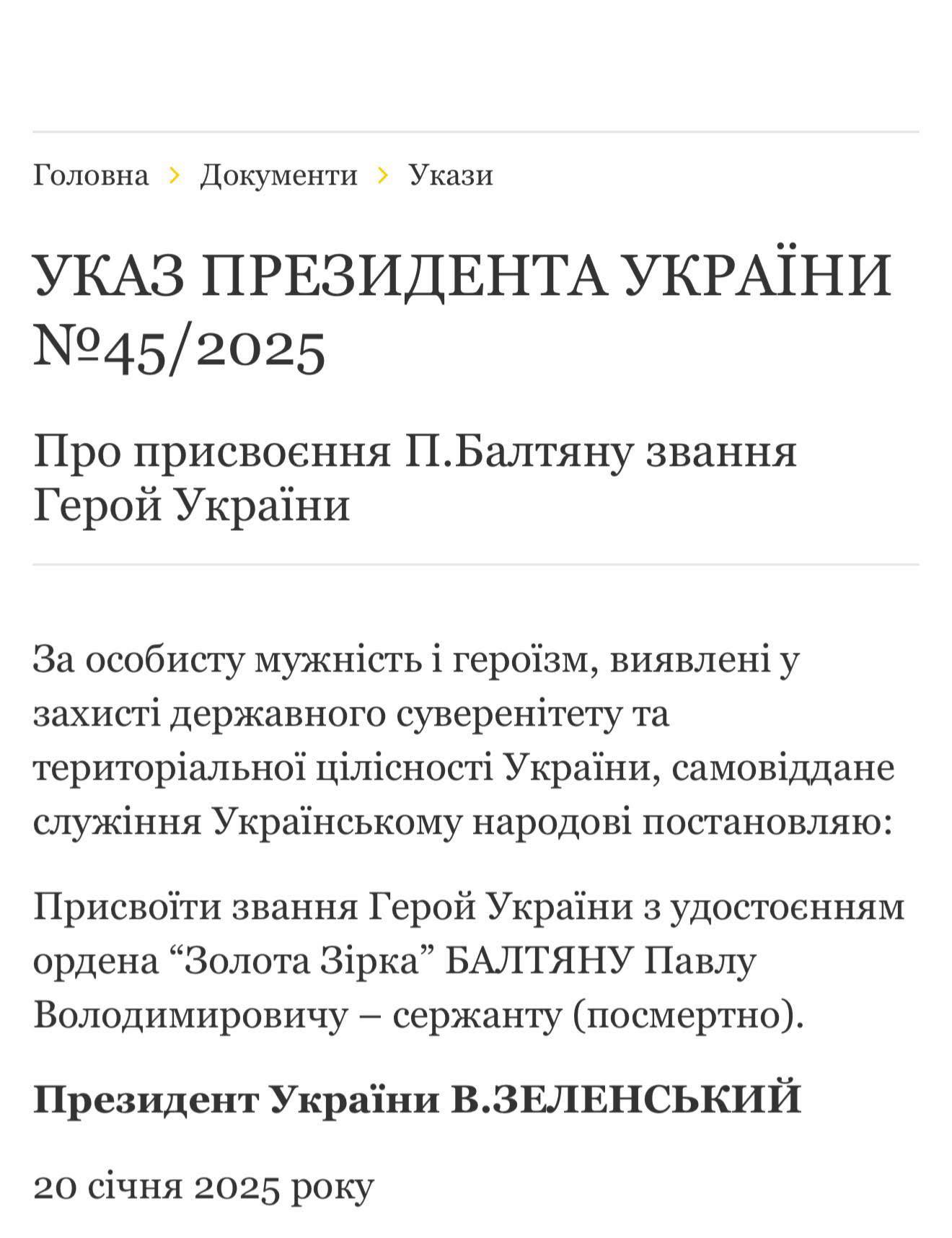 Указом Президента України від 20 січня 2025 року № 45 за особисту мужність і героїзм, виявлену у захисті державного суверенітету та територіальної цілісності України, самовіддане служіння Українському народові БАЛТЯНУ ПАВЛУ ВОЛОДИМИРОВИЧУ – сержанту присвоєно звання Героя України посмертно з удостоєнням ордена «ЗОЛОТА ЗІРКА». Павло Балтян, справжній герой України, назавжди залишиться в нашій пам’яті.