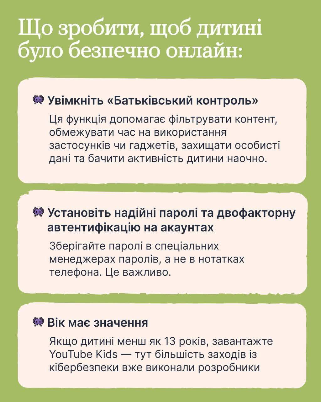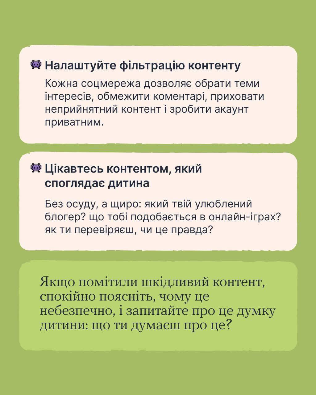 Важливо навчити дітей розпізнавати небезпечні ситуації, обговорювати з ними, що є припустимим, а що ні, і як поводитися в незрозумілих або загрозливих обставинах. Наприклад, пояснити, чому не варто ділитися особистою інформацією, фотографіями чи геоданими з незнайомцями. Також варто наголошувати на важливості конфіденційності паролів та обережного ставлення до завантажень невідомого вмісту. Створення сімейних правил щодо користування гаджетами та інтернетом, спільний час в онлайн-іграх або перегляд освітнього контенту може допомогти батькам краще зрозуміти цифрові інтереси своїх дітей та забезпечити належний контроль.