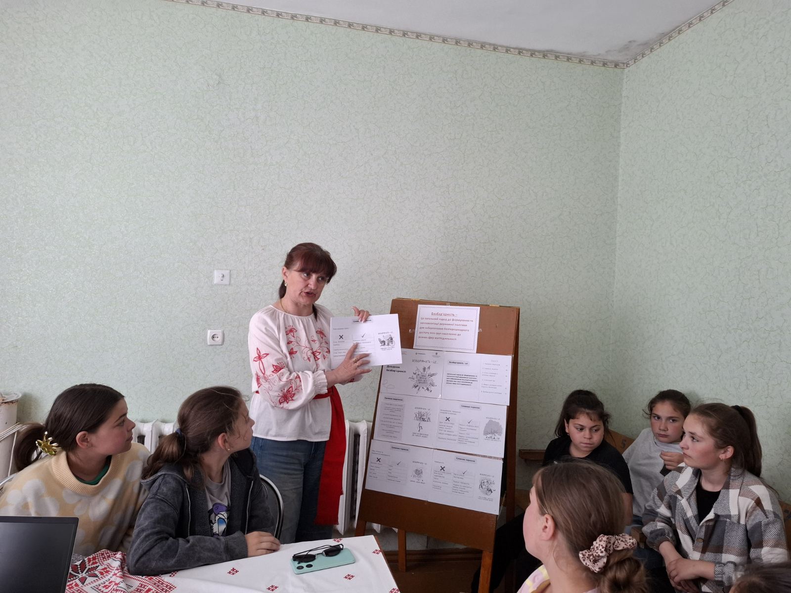Учасники мали нагоду познайомитися з гостею заходу – Степановою Юлією, яка пересувається на колісному кріслі, та її мамою, яка має інвалідність I групи. Ведуча заходу розповіла присутнім про важливість безбар’єрності, наголосивши, що безбар’єрність – це можливість для людей вільно пересуватися, навчатися, працювати та подорожувати, незалежно від їх інвалідності, віку, статі чи інших особливостей. Це концепція, яка базується на зручності та повазі до потреб кожної людини. Діти запевнили Юлію, що будуть частіше спілкуватися з нею.