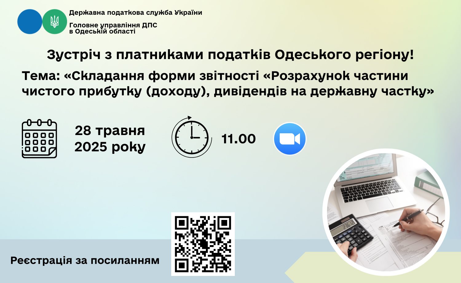 Зустріч відбудеться 28 травня 2025 року об 11:00 у форматі онлайн на платформі ZOOM. Це зручний спосіб взяти участь у заході, не виходячи з дому чи офісу. Фахівці управління оподаткування юридичних осіб Головного управління ДПС в Одеській області виступлять спікерами, надаючи професійні консультації та відповіді на запитання.