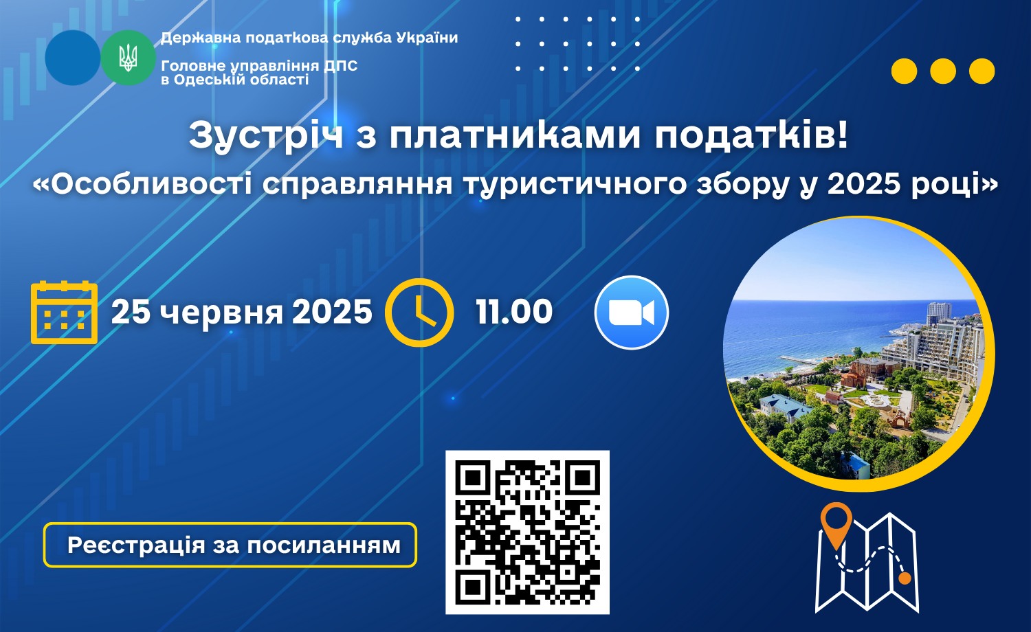Головне управління Державної податкової служби в Одеській області запрошує всіх зацікавлених платників податків регіону долучитися до ключової онлайн-зустрічі, присвяченої актуальній темі: «Особливості справляння туристичного збору у 2025 році». Цей вебінар стане незамінним джерелом інформації для представників готельного бізнесу, туроператорів, власників закладів розміщення, приватних підприємців, які надають послуги з тимчасового проживання, а також усіх, хто працює у сфері туризму та гостинності в Одеській області.Враховуючи динамічні зміни у податковому законодавстві та економічному середовищі, розуміння нюансів справляння туристичного збору у 2025 році є критично важливим для забезпечення безперебійної та законної діяльності. Учасники зустрічі отримають вичерпні роз’яснення безпосередньо від фахівців управління оподаткування юридичних та фізичних осіб Головного управління ДПС в Одеській області. Це унікальна можливість з перших вуст дізнатися про всі нововведення, потенційні зміни та вимоги, що стосуватимуться нарахування та сплати туристичного збору наступного року.Онлайн-зустріч відбудеться 25 червня 2025 року об 11:00 на платформі ZOOM, що забезпечує зручний доступ з будь-якого куточка регіону. Щоб гарантувати свою участь у цьому важливому заході, необхідно обов’язково пройти реєстрацію. Реєстрація триватиме до 14:00 24 червня 2025 року. Посилання для реєстрації доступне за адресою: https://forms.gle/GDzEzVUzVEuNvY5c6. Після успішної реєстрації, напередодні заходу, на вказану вами електронну пошту буде надіслано персональне посилання для доступу до конференції Zoom.Ми заохочуємо учасників завчасно підготувати питання, що стосуються справляння туристичного збору у 2025 році, та зазначити їх під час реєстрації. Це дозволить спікерам максимально повно та ефективно відповісти на всі запити, зробивши вебінар максимально корисним та адаптованим до потреб аудиторії. Обговорення конкретних кейсів та проблемних питань допоможе уникнути непорозумінь та потенційних податкових ризиків у майбутньому.Участь у цьому вебінарі – це не лише можливість отримати актуальну інформацію про податкові зміни, а й шанс налагодити пряму комунікацію з представниками податкової служби. Це сприятиме підвищенню податкової грамотності та забезпеченню прозорості у взаємодії між бізнесом та контролюючими органами. Ефективне оподаткування туризму є важливою складовою розвитку місцевих бюджетів та підтримки інфраструктури Одеського регіону. Не пропустіть нагоду бути в курсі всіх податкових нововведень щодо туристичного збору 2025 та забезпечити відповідність свого бізнесу вимогам законодавства.Для отримання додаткової інформації або зворотного зв’язку можна звертатися за контактним телефоном (048) 705 60 18. Графік роботи: з понеділка по п’ятницю з 08:30 до 17:00._____________________________________________☎️ Гаряча лінія ДПС: 0800 501 007📱Мобільний застосунок «Моя податкова»Android https://play.google.com/store/apps/details?id=my.tax.gov.uaiOS https://t1p.de/lgu5a🖥 Онлайн-навчання: https://tax.gov.ua/baneryi/onlayn-navchannya/📧 Для оперативної комунікації з інститутами громадянського суспільства в органах ДПС діють комунікаційні податкові платформи: https://t1p.de/aq4sp📧Комунікаційна платформа Одещини: [email protected]://od.tax.gov.ua/#ДПС_в_Одеській_області