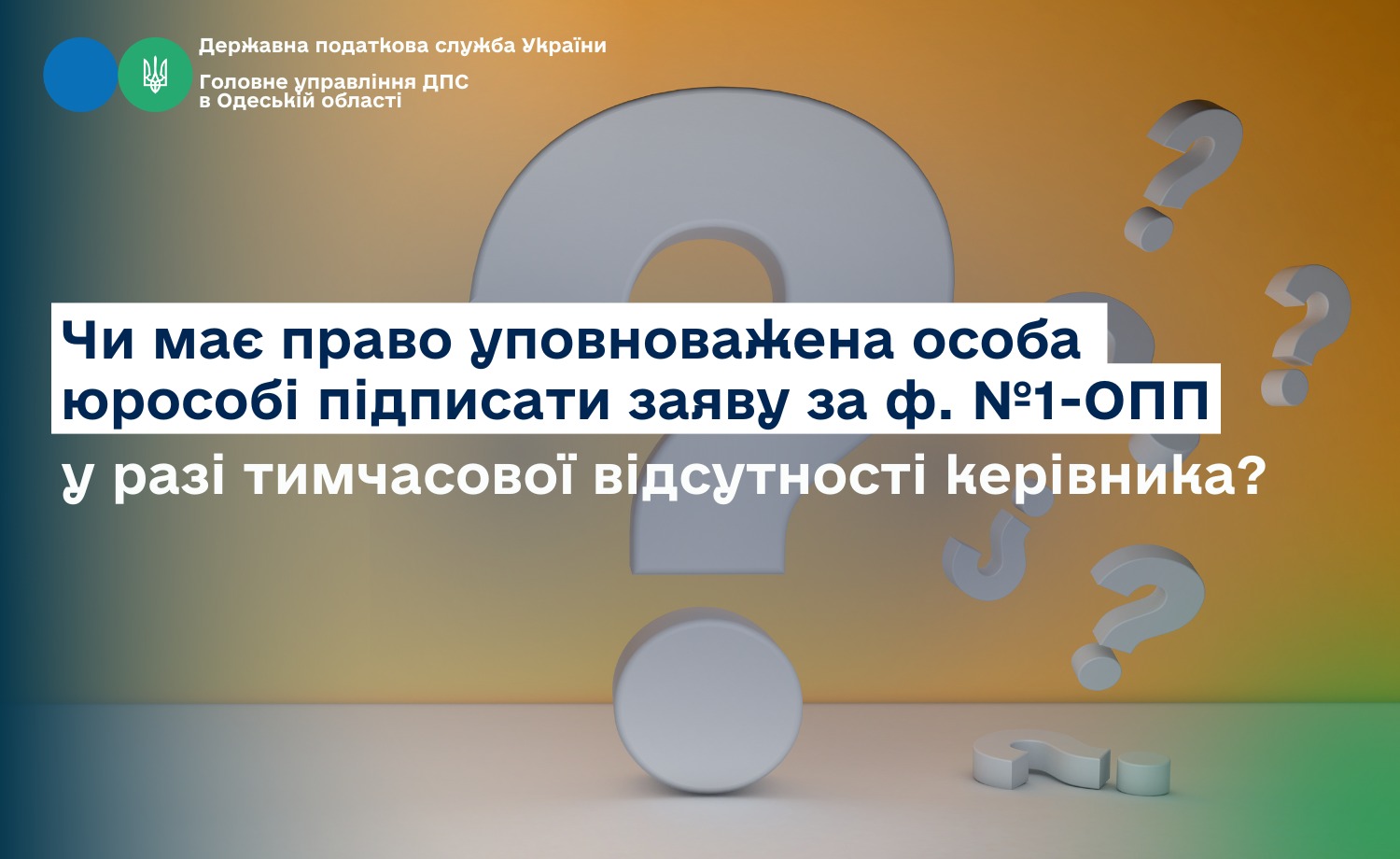 У разі відсутності керівника з об’єктивних причин, заяву за ф. № 1-ОПП може підписати інша особа, яка уповноважена установчими та/або організаційно-розпорядчими документами виконувати обов’язки керівника на час його відсутності, за умови, що повноваження особи, яка підписала заяву за ф. № 1-ОПП, підтверджені відповідними документами (установчими, наказами чи розпорядженнями тощо), які подаються разом з заявою за ф. №1-ОПП до контролюючого органу.