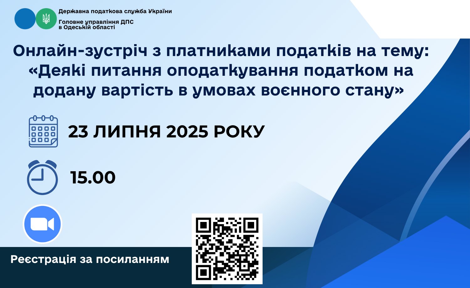 Головне управління ДПС в Одеській області запрошує платників податків регіону взяти участь в онлайн-зустрічі на тему: «Деякі питання оподаткування податком на додану вартість в умовах воєнного стану».