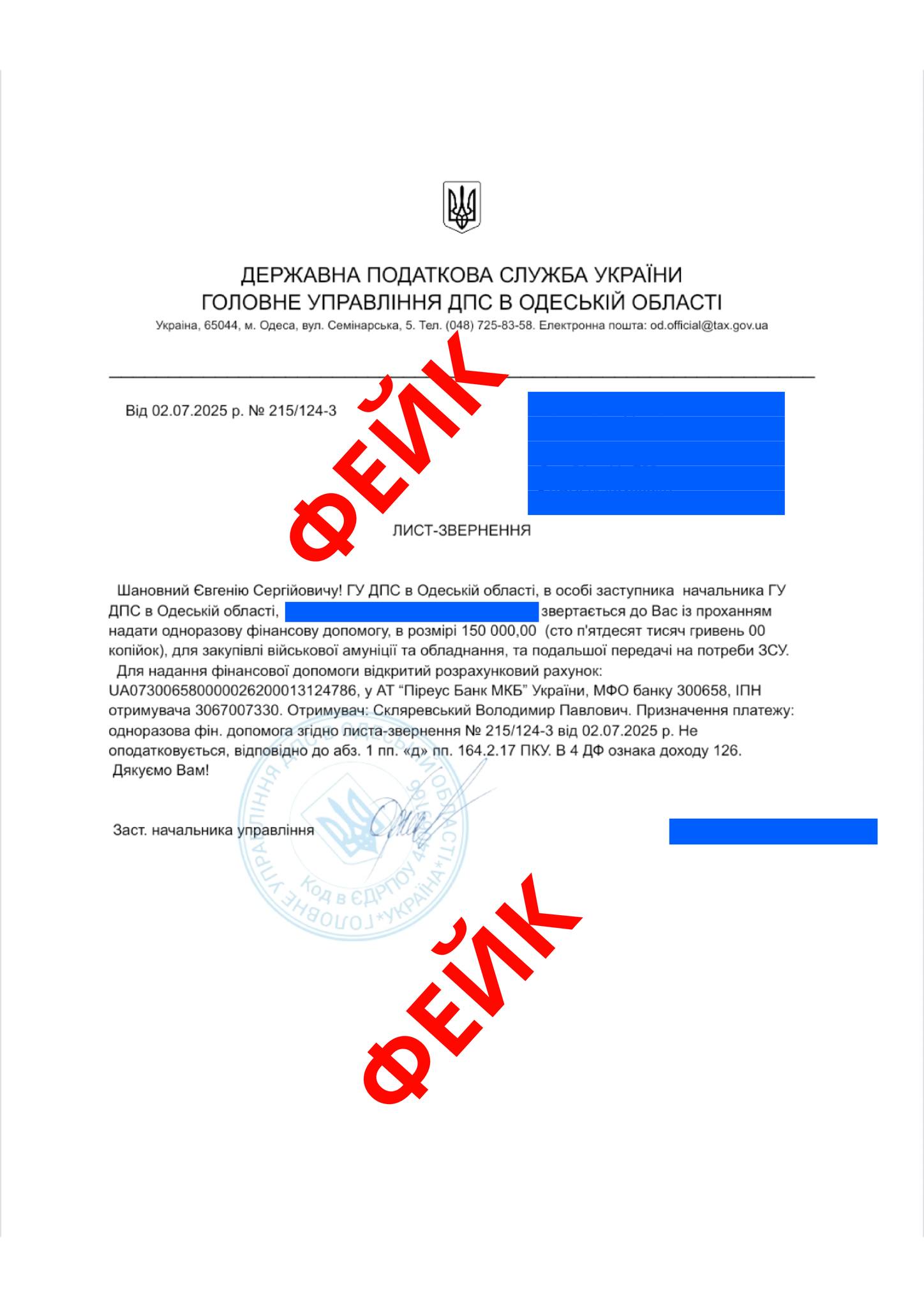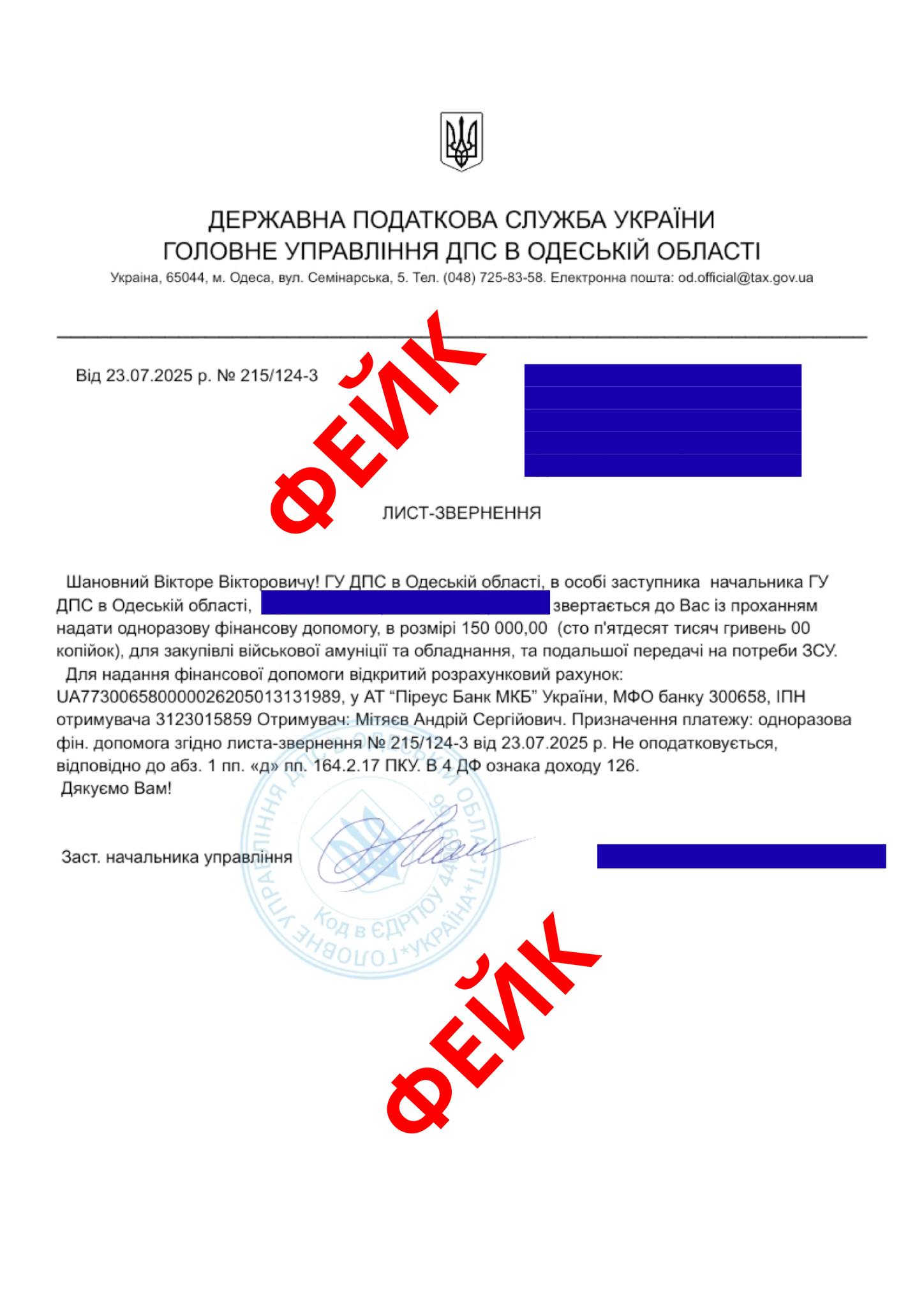 Останнім часом до Головного управління ДПС в Одеській області надходять непоодинокі повідомлення про випадки отримання суб’єктами господарювання фейкових листів, повідомлень та дзвінків нібито від посадових осіб Головного управління ДПС в Одеській області з метою незаконного заволодіння грошовими коштами.