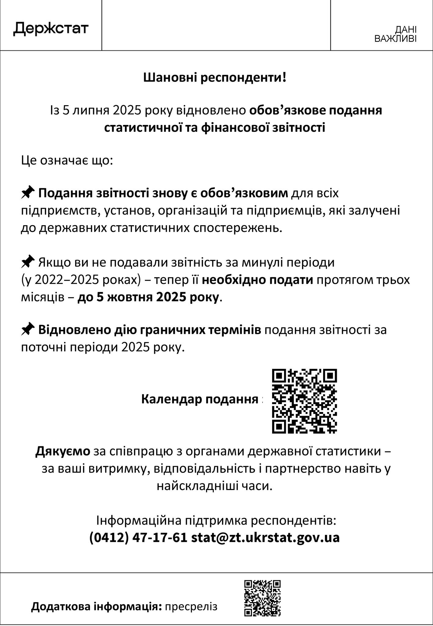 Головне управління статистики у Житомирській області повідомляє: з 5 липня 2025 року відновлено обов’язкове подання статистичної та фінансової звітності