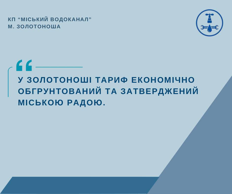 На сьогоднішній день, тариф у Золотоноші є економічно обґрунтованим і затвердженим рішенням міської ради. Для прикладу, вартість кубометра води в Золотоноші становить 60 грн, тоді як у Звенигородці – 76 грн, у Корсунь-Шевченківському – 74 грн, а в Чигирині – 63 грн. Ці міста мають схожу кількість населення та географічне розташування, що робить порівняння більш коректним.