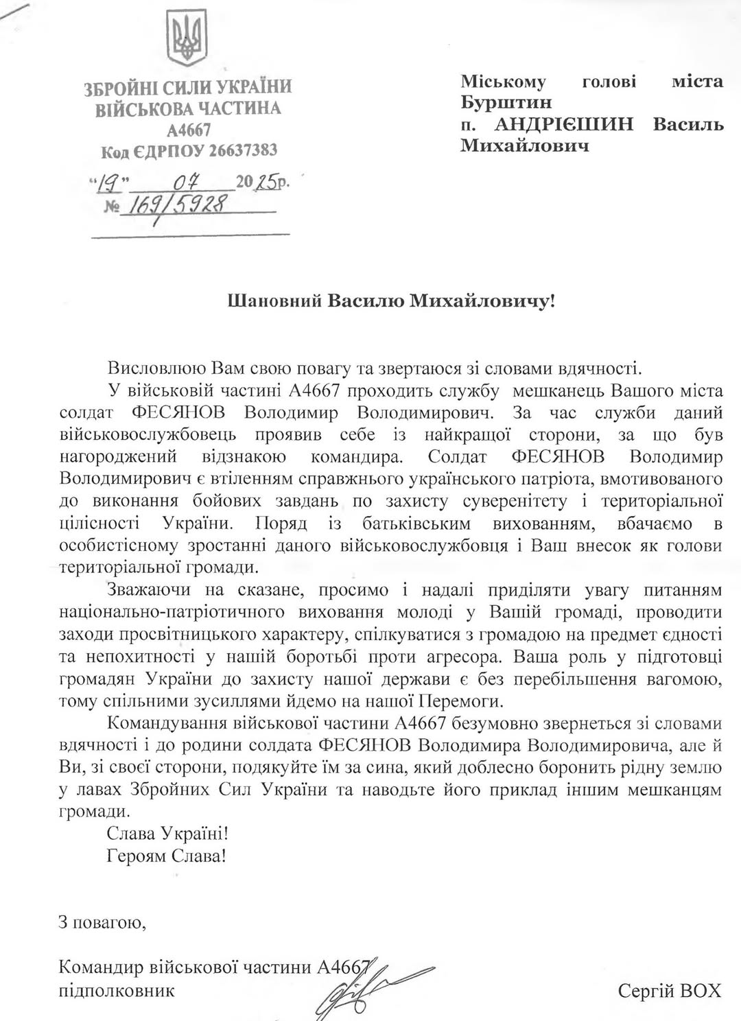 Бурштинська міська рада отримала зворушливий лист-подяку від командування військової частини А4667. У ньому висловлюється глибока вдячність усій громаді за неоціненну підтримку Збройних Сил України. Особлива шана приділена нашому земляку, солдату Фесянову Володимиру, який з гідністю несе службу в лавах ЗСУ. Командування підкреслює, що Володимир зарекомендував себе як мужній, відповідальний та дисциплінований військовослужбовець, який заслужив на довіру та глибоку повагу. Його приклад наслідування для побратимів, адже він стійко виконує найскладніші бойові завдання, служить зі щирою вірою в неминучу перемогу та, що найважливіше, ніколи не забуває про своє рідне місто Бурштин. Ми щиро вдячні його родині за виховання такого гідного сина України. Саме родинна підтримка стає непохитною опорою для наших воїнів у ці надзвичайно складні часи. Командування наголошує, що допомога від громади має колосальне значення для підтримання бойового духу армії. Такі захисники, як Володимир Фесянов, є справжньою гордістю нашого міста та яскравим прикладом для всіх нас. Дякуємо за службу, Володимире! Пишаємося кожним нашим воїном і не втомлюємося нагадувати: ви — наші Герої! Слава Україні! Героям Слава!