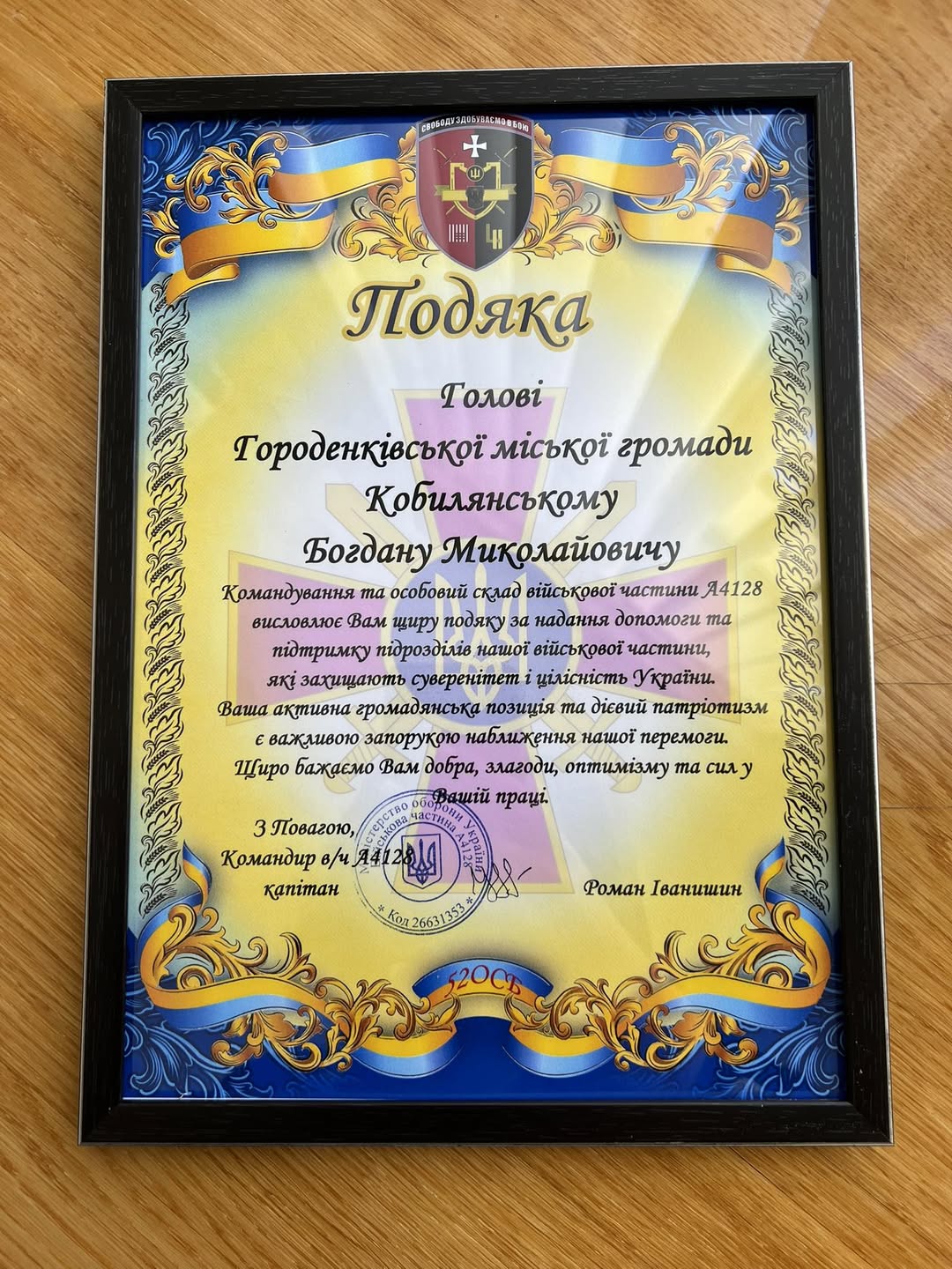 Городенківська громада отримала щиру подяку від військової частини А4128 за неоціненну підтримку та допомогу. Міський голова Богдан Кобилянський отримав подяку від командування та особового складу частини як визнання внеску всіх мешканців громади. Мешканці Городенківщини активно долучаються до підтримки військовослужбовців, демонструючи єдність та небайдужість.
