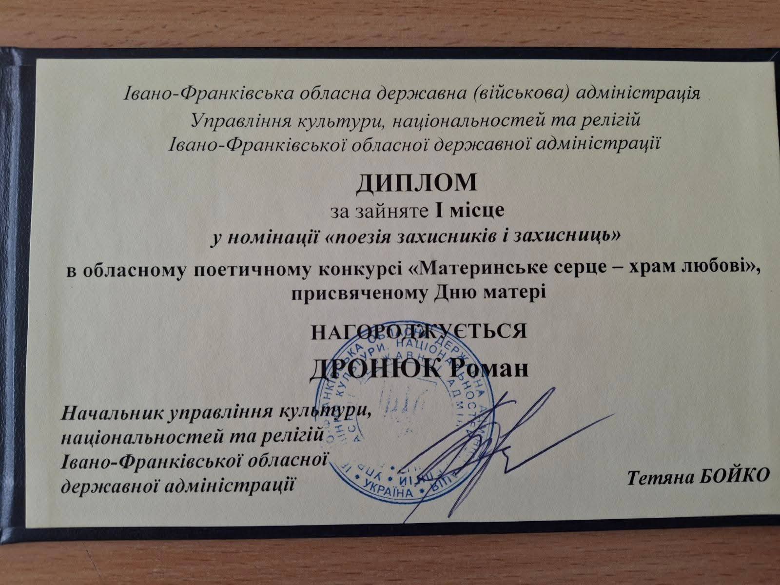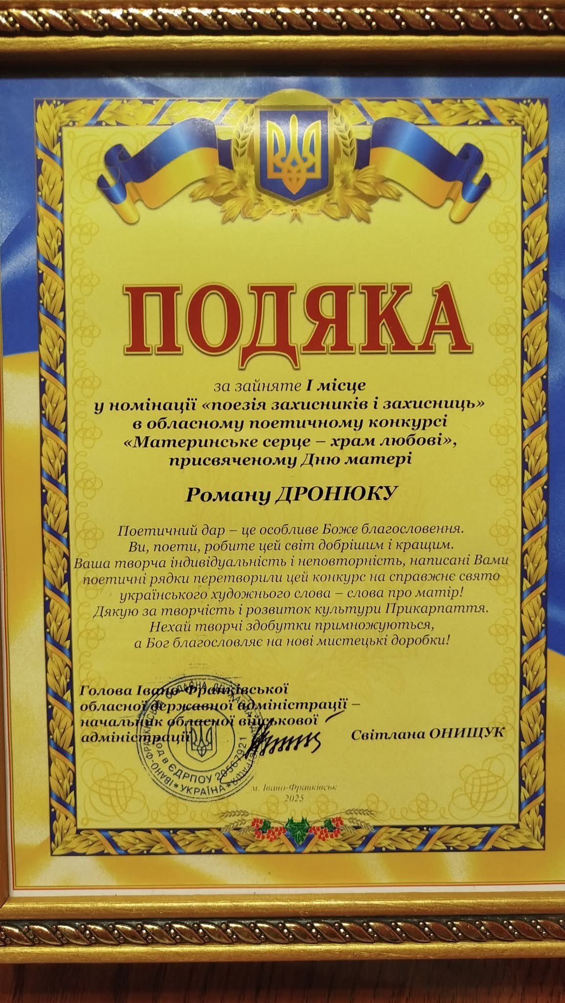 Городенківська міська рада від щирого серця вітає Романа Дронюка з визначною перемогою! Він посів почесне І місце у номінації «Поезія захисників і захисниць» на обласному поетичному конкурсі «Материнське серце – храм любові», який був присвячений Дню матері. Це досягнення є яскравим свідченням глибокого таланту Романа, щирості його слова та непохитної громадянської позиції. Його поезія надихає, зворушує серця читачів і звучить як потужний голос правди, любові до рідної землі, матері та України. Ми висловлюємо щиру подяку Роману за його невтомну творчість, глибокий патріотизм та неймовірну духовну силу. Бажаємо йому нових мистецьких звершень, невичерпного натхнення та Божого захисту в усіх починаннях!