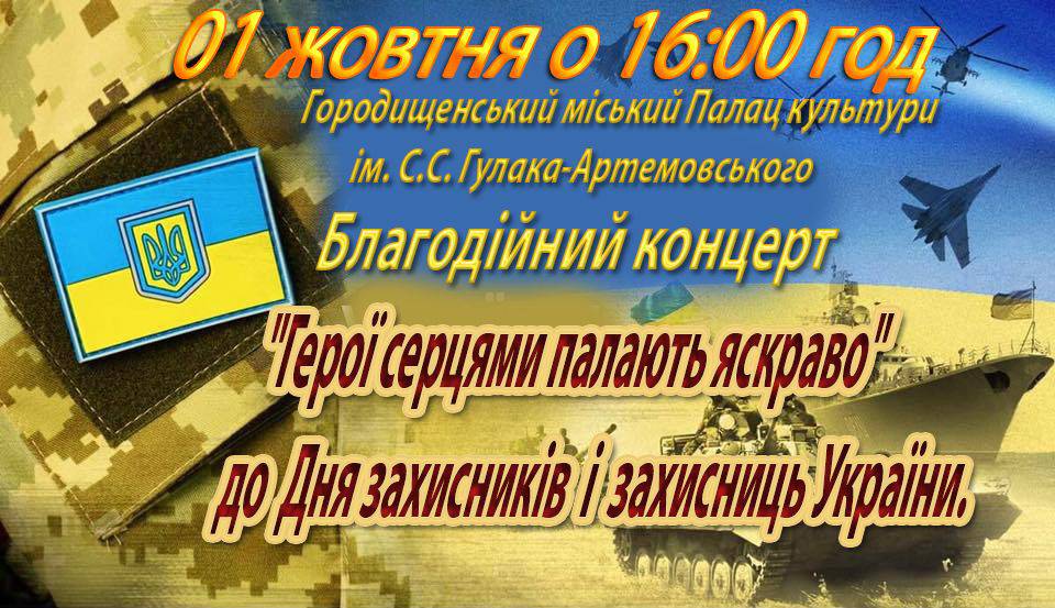 🔊 Городищенський міський Палац культури запрошує всіх на особливий захід – благодійний концерт “Герої серцями палають яскраво”. Ця подія присвячена Дню захисників і захисниць України і відбудеться 01.10.2025 року о 16:00.