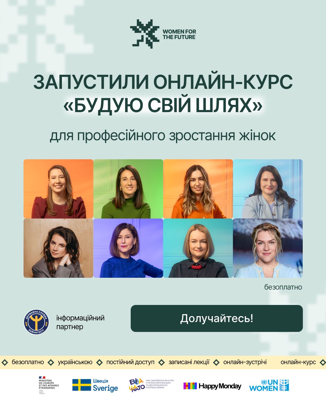 💫 Happy Monday спільно з UN Women Ukraine / ООН Жінки в Україні запустили абсолютно безоплатний онлайн-курс «Будую свій шлях», спрямований на професійне зростання жінок. Цей курс є частиною важливої ініціативи Women For The Future. Це ваша чудова нагода побудувати нові кар’єрні траєкторії, незалежно від обраного типу кар’єри, напряму діяльності, рівня компетенцій чи будь-яких інших факторів. Навчіться отримувати задоволення та гідну винагороду від реалізації власного потенціалу!