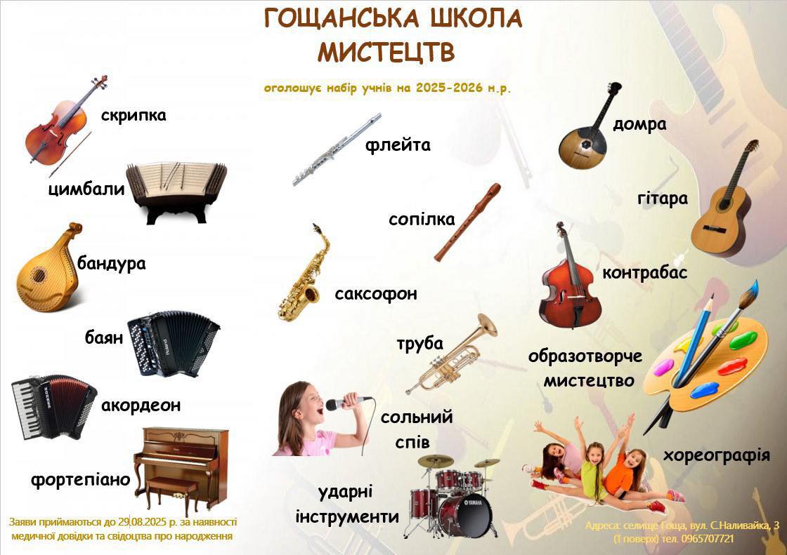 🎨🎶 Гощанська школа мистецтв офіційно оголошує про початок набору учнів на новий 2025–2026 навчальний рік! Ми радо запрошуємо всіх талановитих дітей приєднатися до нашої дружньої родини та відкрити для себе дивовижний світ музики, хореографії та образотворчого мистецтва. Наша школа надає унікальну можливість для всебічного розвитку юних талантів, формуючи їхнє майбутнє через мистецтво.