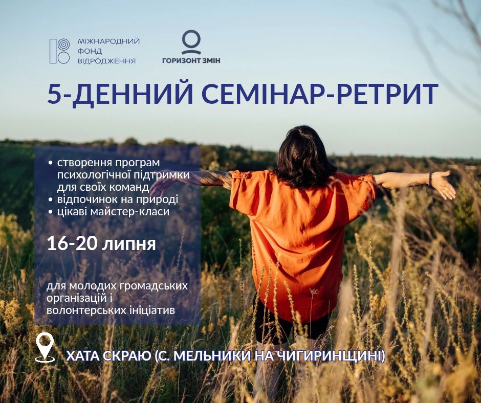 🎯 ГО “Горизонт змін” запрошує представників та представниць молодих громадських організацій та незареєстрованих ініціатив на 5-денний семінар-ретрит! Цей семінар-ретрит стане чудовою можливістю для відновлення ресурсу та отримання нових знань.