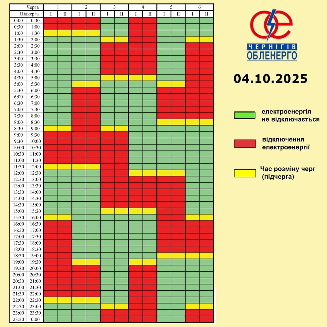 🔸 На офіційному сайті вашого енергопостачальника – [https://chernihivoblenergo.com.ua/blackouts](https://chernihivoblenergo.com.ua/blackouts). Тут ви знайдете актуальний розклад та зможете дізнатися, чи потрапляє ваша адреса до певної черги.