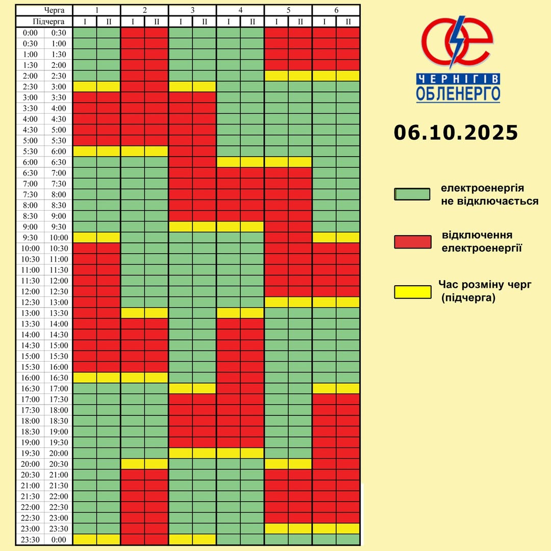 Шановні мешканці Чернігівщини! Інформуємо вас про прогнозований графік погодинних відключень (ГПВ) на 6 жовтня. Ми докладаємо максимум зусиль, щоб мінімізувати незручності, пов’язані з обмеженнями.