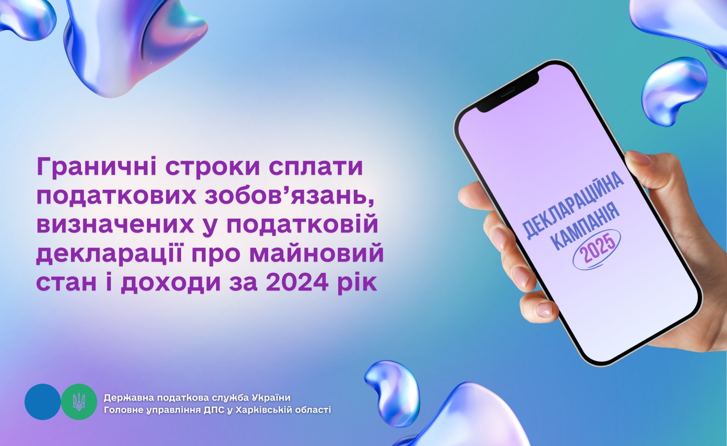 Головне управління ДПС у Харківській області нагадує граничні строки сплати податкових зобов’язань, визначених у податковій декларації про майновий стан і доходи за 2024 рік:
