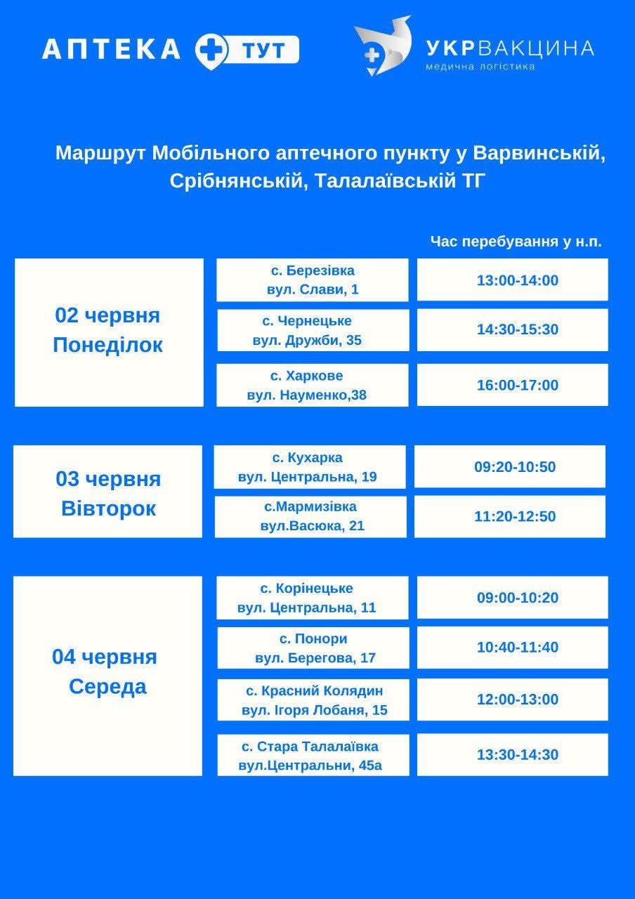Дізнайтеся про графік прибуття мобільних аптечних пунктів у населені пункти Варвинської, Срібнянської та Талалаївської громад. Ця ініціатива, спрямована на покращення доступу до ліків та фармацевтичної допомоги, реалізується в рамках проєкту “Інновації для подолання ВІЛ” за підтримки агентства США з міжнародного розвитку (USAID).