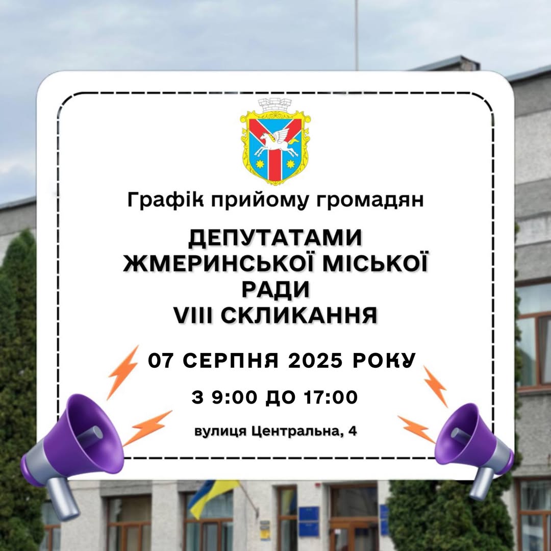 7 серпня 2025 року з 9:00 години до 17:00 години, в залі засідань виконавчого комітету міської ради (м. Жмеринка, вул. Центральна, 4) буде проходити особистий прийом громадян депутатами міської ради.