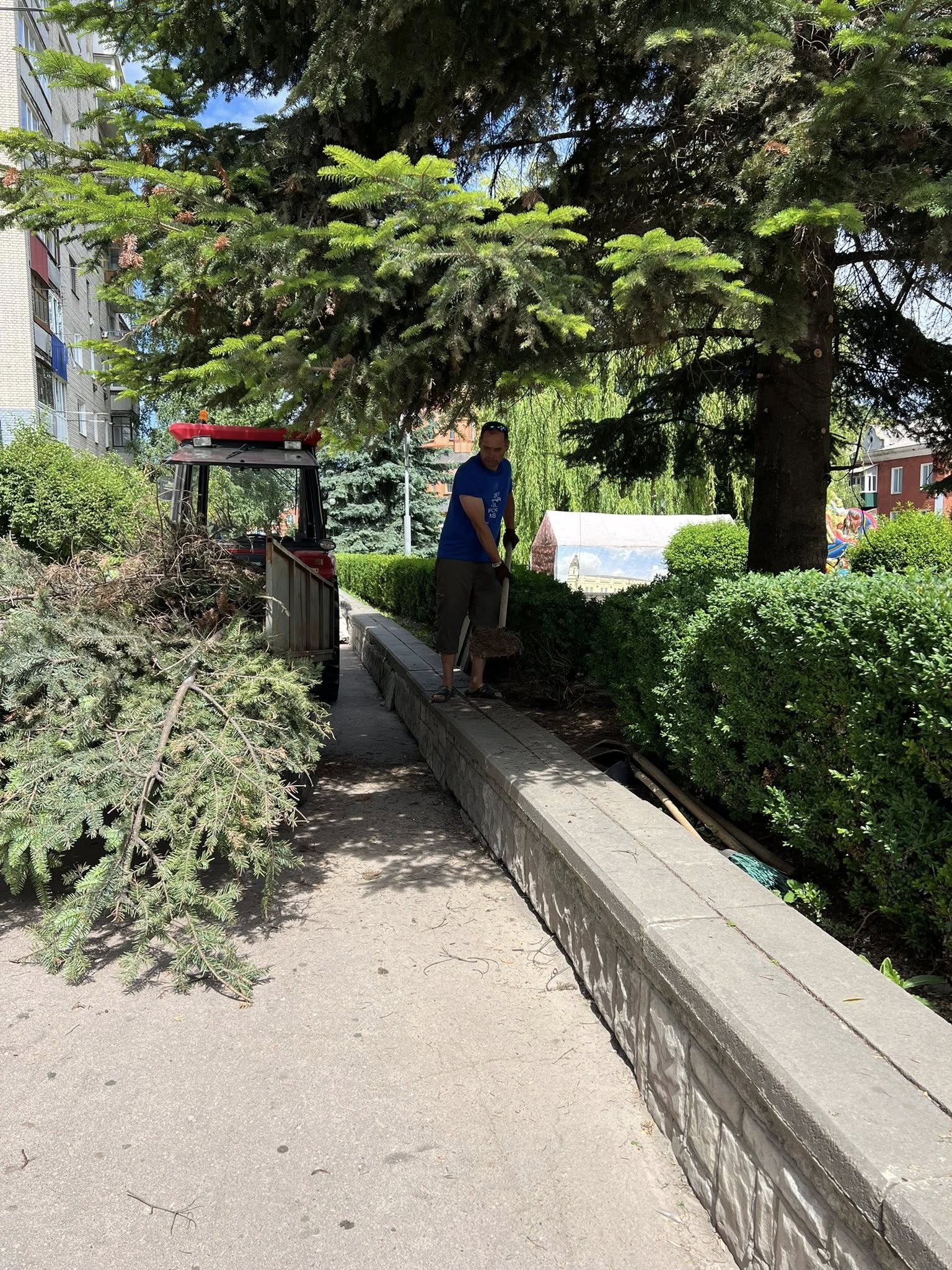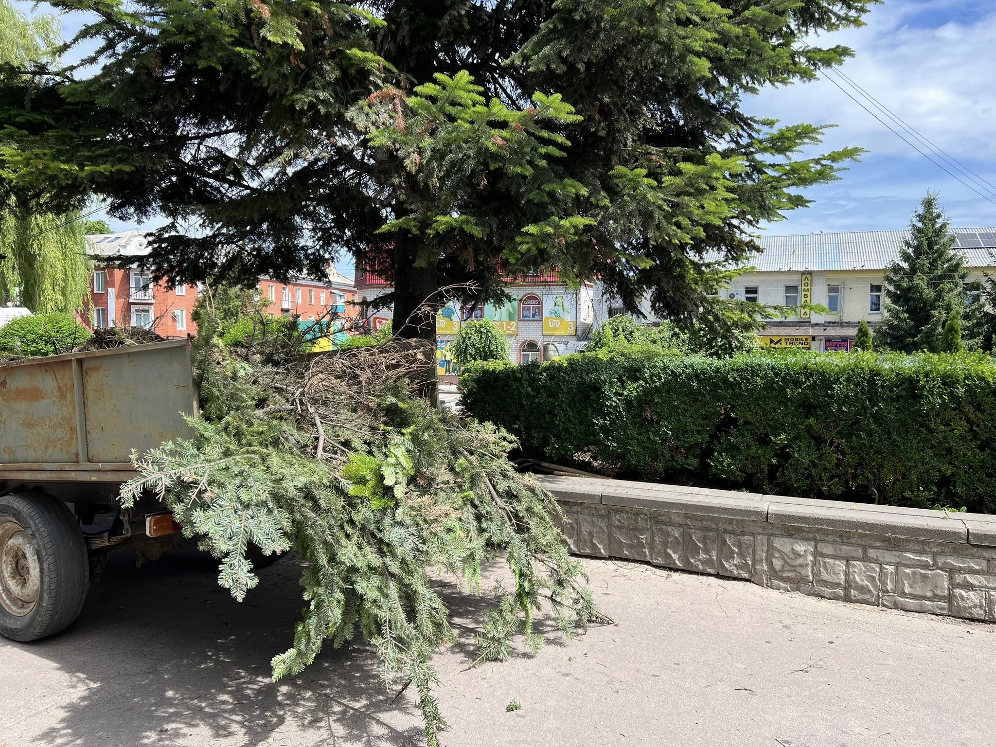 🌱🌲Сьогодні наші хлопці з благоустрою працювали на Центральній площі. Обрізали нижні гілки ялинок, щоб деревам було легше “дихати”, а також боролись з бур’янцем між плиткою, після дощів він пішов у ріст.