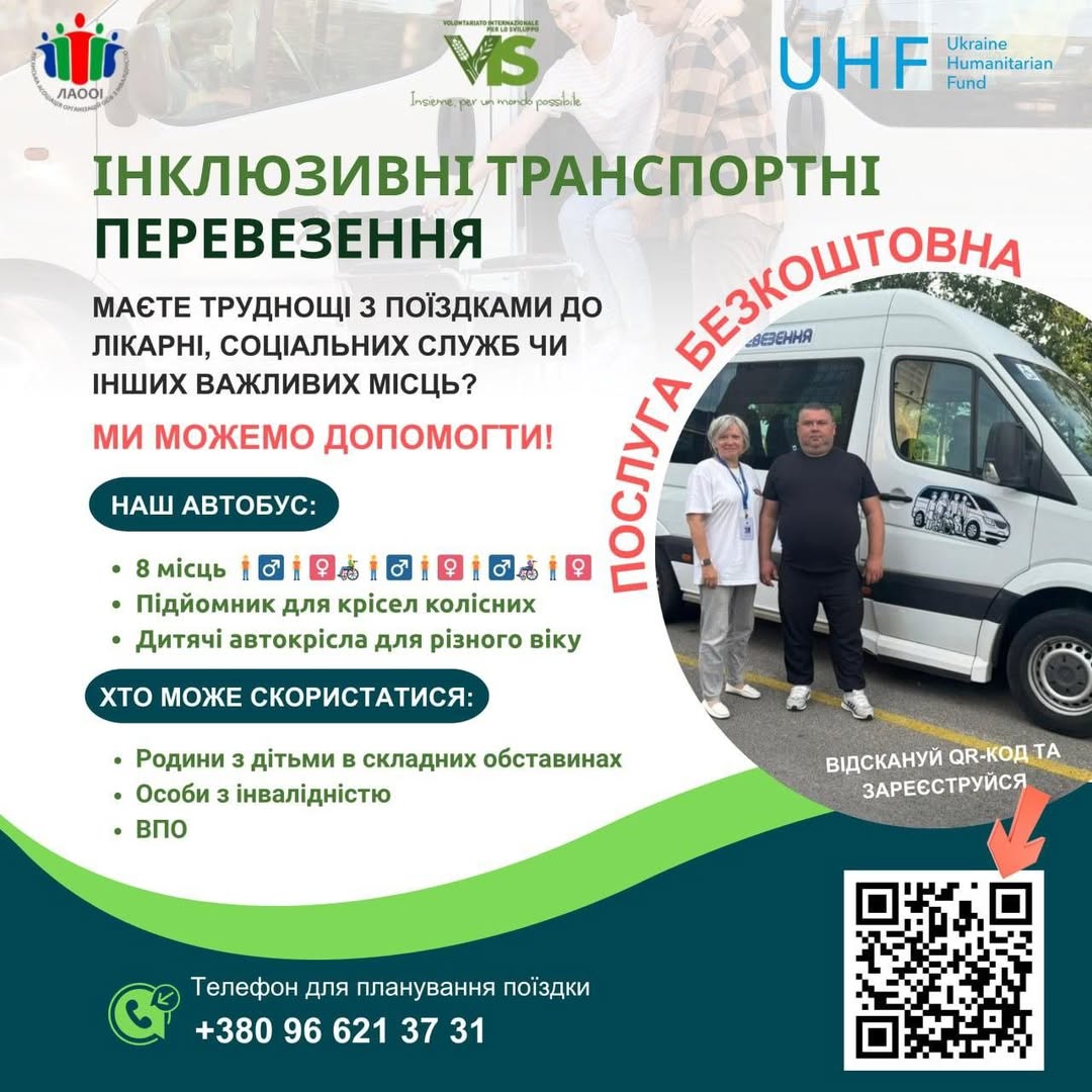 🚀 Шановні мешканці громади! Раді повідомити про запуск безкоштовної послуги інклюзивних транспортних перевезень. Ця ініціатива спрямована на підтримку осіб, які мають труднощі з самостійним пересуванням, та забезпечує їм доступ до медичних закладів, соціальних служб та інших важливих установ.