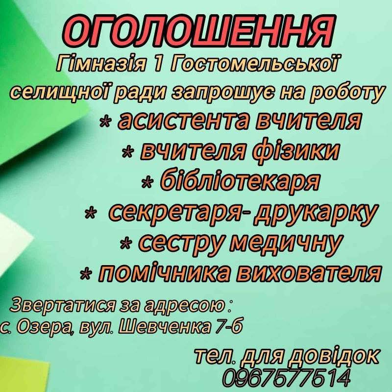 Гімназія №1 Гостомельської селищної ради запрошує на роботу кваліфікованих спеціалістів.