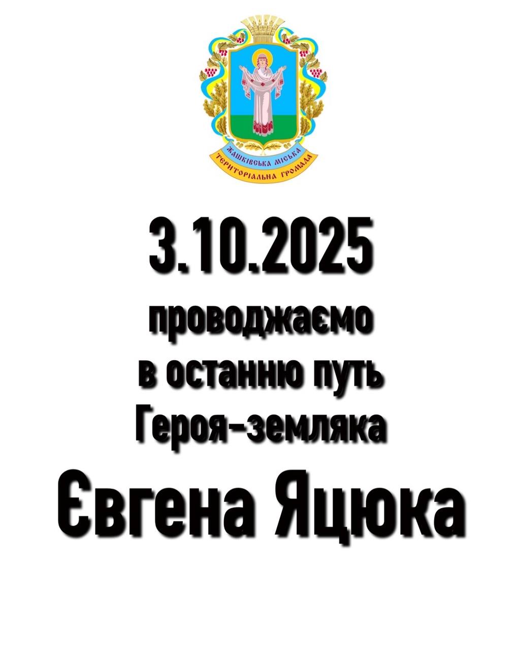 Сумна звістка для Жашківської громади, але обов’язок кожного – віддати належну шану ще одному мужньому воїну, який віддав життя за свободу та незалежність України. Завтра, 3 жовтня 2025 року, наша громада проводжатиме в останню путь захисника України – Яцюка Євгена Миколайовича.