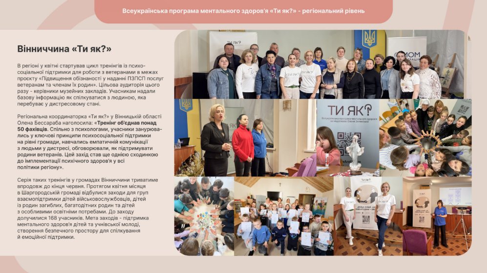Також у дайджесті представлені новини Регіональної координації Програми «Ти як?», зокрема, про серію тренінгів із психосоціальної підтримки для роботи з ветеранами, які проводяться на Вінниччині в межах проєкту «Підвищення обізнаності у наданні ПЗПСП послуг ветеранам та членам їх родин». Програма «Ти як?» активно розвиває напрямок психологічної допомоги.