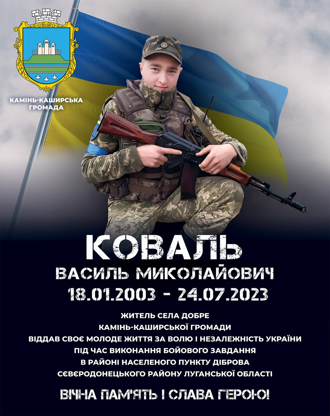 Два роки тому Камінь-Каширська громада вшанувала пам’ять свого молодого Героя – Коваля Василя Миколайовича. Цей відважний воїн, наймолодший у багатодітній родині, завжди був відомий своєю добротою, чуйністю та працьовитістю. Василь також служив паламарем у своєму рідному храмі, виявляючи глибоку віру та відданість.