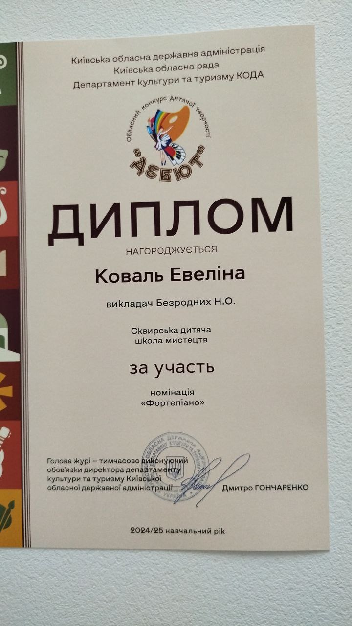 Сквирська дитяча школа мистецтв пишається своїми учнями, які гідно представили громаду на обласному конкурсі дитячої творчості “Дебют”, організованому Департаментом культури і туризму Київської ОДА. Юні митці продемонстрували високий рівень майстерності та творчий потенціал.