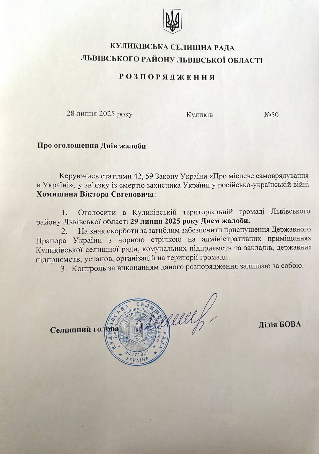 Трагічна звістка сколихнула Куликівську громаду: 29 липня 2025 року відзначено як День жалоби. Рішення прийнято з метою гідного вшанування пам’яті полеглого Героя України, Хомишина Віктора Євгеновича. Його самовідданість та відвага стали прикладом для багатьох. Цей день – не лише привід для скорботи, а й нагода згадати про ціну миру та свободи, яку відстояв Віктор Хомишин. Вічна пам’ять воїну, який навіки залишиться в наших серцях. Його подвиг не буде забутий, а пам’ять про нього житиме у серцях українців. Ця втрата є тяжкою для громади та всієї країни, адже кожен полеглий Захисник – це незагойна рана. Світла пам’ять Хомишину Віктору Євгеновичу!