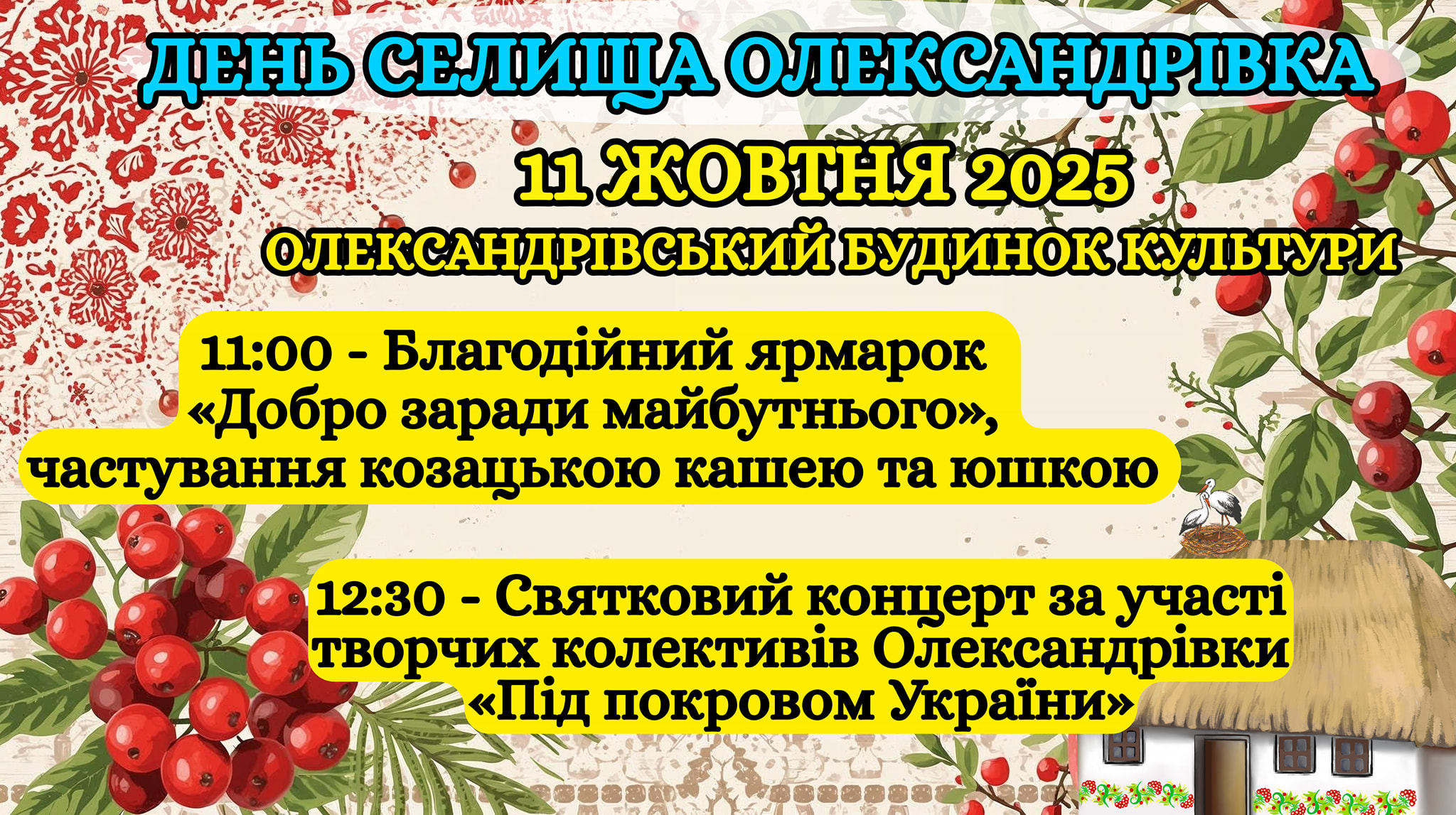 Цей день стане свідченням нашої єдності та сили духу. Ми відзначимо досягнення нашої громади, вшануємо її красу та незламність. Це можливість згуртуватися, поспілкуватися та створити теплі спогади. Разом ми будуємо майбутнє нашої Олександрівки!
