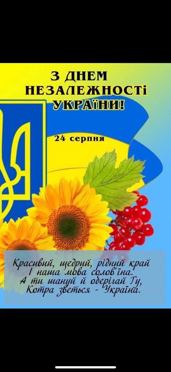 Сьогодні Україна відзначає найважливіше свято – День Незалежності. Це день, коли ми не лише святкуємо річницю нашої державності, але й з глибокою повагою вшановуємо мужність, стійкість та незламний дух українського народу. Ми висловлюємо щиру вдячність тим, хто захищав і продовжує захищати наше право на свободу та незалежність, тим, хто не дав згаснути вогню нашої волі. Особливо ми згадуємо тих, хто віддав найцінніше – власне життя – за суверенітет та територіальну цілісність України.