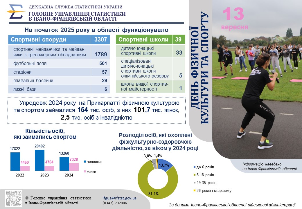 У 2024 році на Прикарпатті фізичною культурою та спортом системно займалися 154 тисячі осіб. Важливою деталлю є гендерний розподіл: 101,7 тисячі з них – це жінки, що підкреслює зростаючу роль жінок у спорті. Крім того, 2,5 тисячі осіб з інвалідністю також активно долучалися до спортивних занять, що свідчить про інклюзивність спортивної політики регіону.