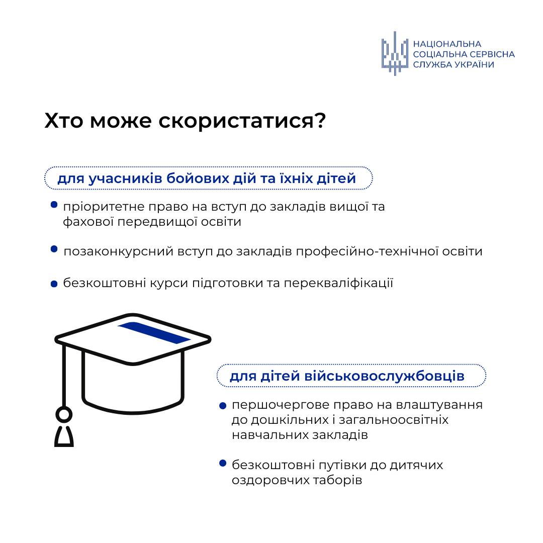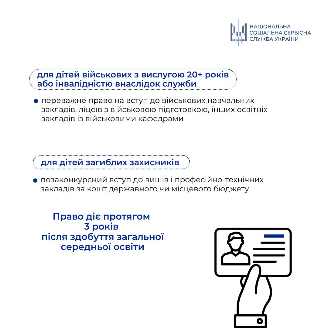 🔹 Крім того, військовослужбовці мають першочергове право на влаштування дітей до дошкільних і загальноосвітніх навчальних закладів та отримання місць у дитячих оздоровчих таборах незалежно від форми власності.
