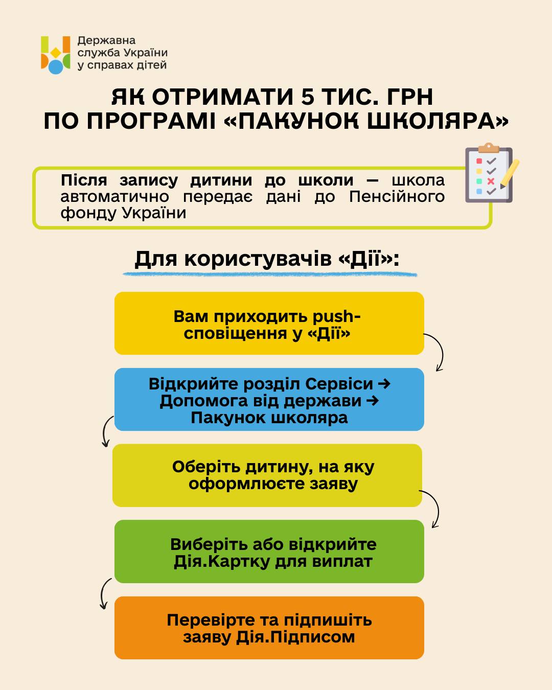 📢 Оновлено: Державна програма «Пакунок школяра» стала доступною для оформлення батьками першокласників! Ця важлива ініціатива покликана полегшити фінансовий тягар підготовки дітей до нового навчального року. 🎒 «Пакунок школяра» передбачає надання одноразової допомоги у розмірі 5000 гривень. Ці кошти призначені для придбання найнеобхідніших речей для першокласників, таких як канцелярські товари, шкільна форма, взуття та інші предмети, що забезпечать комфортний старт у навчанні. Це чудова можливість для батьків та їхніх дітей, яка суттєво полегшить процес підготовки до школи. У наданих матеріалах ви знайдете детальні покрокові інструкції щодо процесу оформлення допомоги. Процедуру можна здійснити як через зручний мобільний додаток «Дія», так і особисто звернувшись до найближчого сервісного центру Пенсійного фонду України. Важливо зазначити, що Державна служба України у справах дітей буде здійснювати ретельний контроль за цільовим використанням виділених коштів. Це стосується випадків, коли отримувачем допомоги є законний представник дитини-сироти або дитини, позбавленої батьківського піклування, що забезпечує прозорість та ефективність програми. ℹ️ Ключові аспекти програми «Пакунок школяра»: 🗓 Термін подання заяв: до 15 листопада 2025 року. Це дає достатньо часу для всіх охочих батьків подати необхідні документи. 💳 Отримання коштів: кошти надходять на ваш рахунок протягом 14 днів після успішного опрацювання поданої заявки. ⏳ Термін використання допомоги: надану допомогу необхідно використати протягом 180 днів з моменту її зарахування на рахунок. 👩🎓 Право на отримання: допомога надається на кожну дитину, яка вперше йде до першого класу, окремо. 🛒 Спосіб оплати: розрахунок за придбані товари здійснюється виключно у безготівковій формі. Це можливо як в онлайн-магазинах, так і в офлайн-торгових точках. Більше деталей щодо державної програми «Пакунок школяра» доступно за посиланням: https://children.gov.ua/news/derzhavna-dopomoha-pakunok-shkolyara. Слідкуйте за актуальними новинами та підтримуйте зв’язок через мій Телеграм-канал: t.me/dobromilsky. #ПакунокШколяра #ЗахистДітей