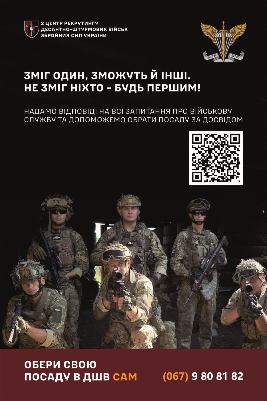 Десантно-штурмові війська завжди готові до нових викликів і запрошують до своїх лав найсміливіших та найрішучіших. Ми шукаємо справжніх фахівців різних напрямків, які прагнуть служити Батьківщині та довести свою професійність. Якщо ви готові до випробувань, прагнете розвитку та мрієте стати частиною елітної бойової одиниці, то шлях ДШВ – це ваш шлях.