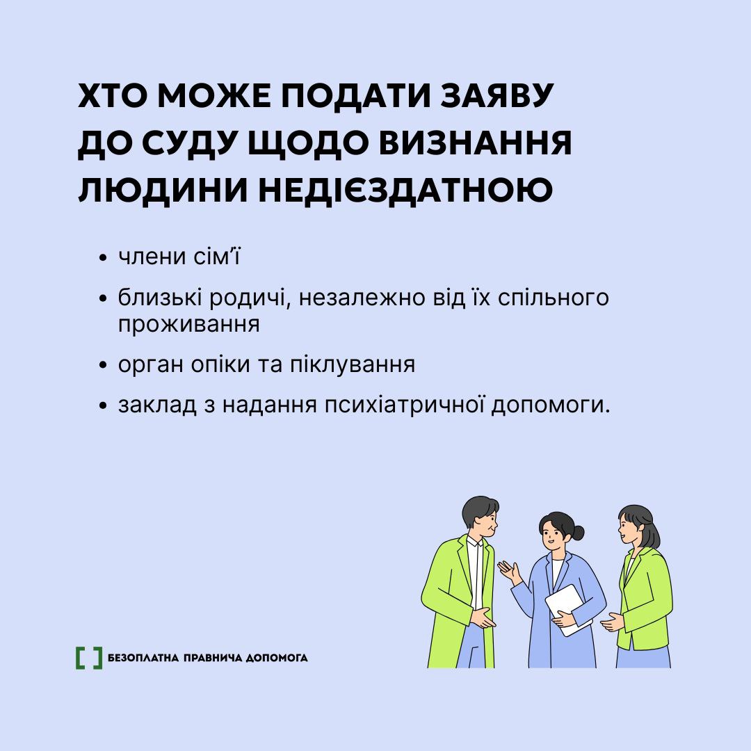 🟩 Особам з психічними розладами буває складно усвідомлювати свої дії та їхні наслідки. Для захисту прав таких громадян та здійснення юридично значущих дій від їхнього імені існує важливий механізм – визнання особи недієздатною. Ця процедура дозволяє призначити опікуна, який діятиме в інтересах недієздатної особи. Докладніше про це та як отримати юридичну допомогу, читайте в картках⤵