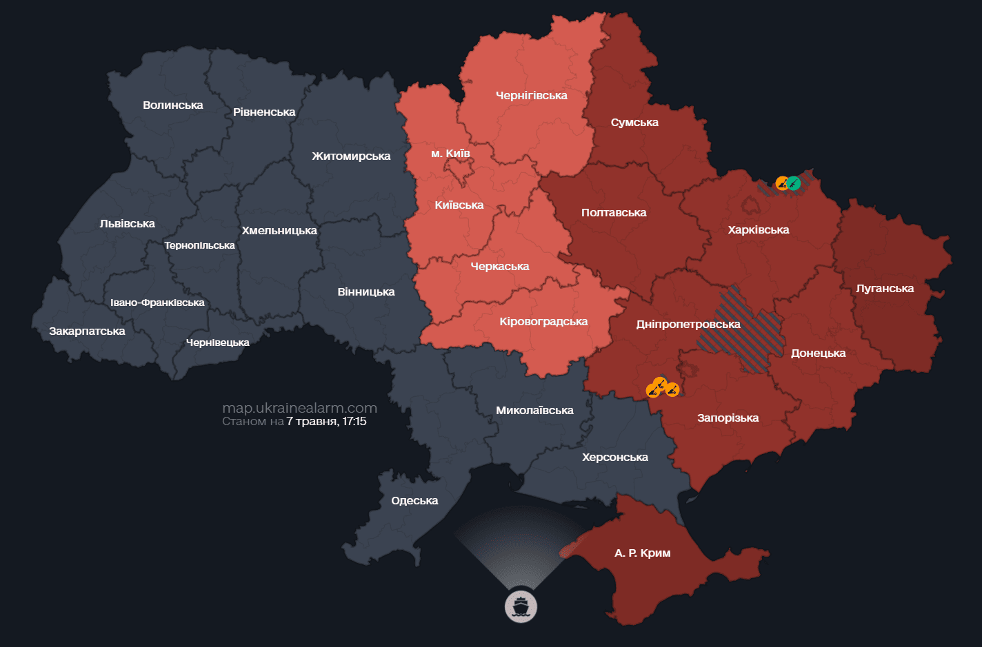Станом на 7 травня 17:15 повітряна тривога оголошена в таких областях: